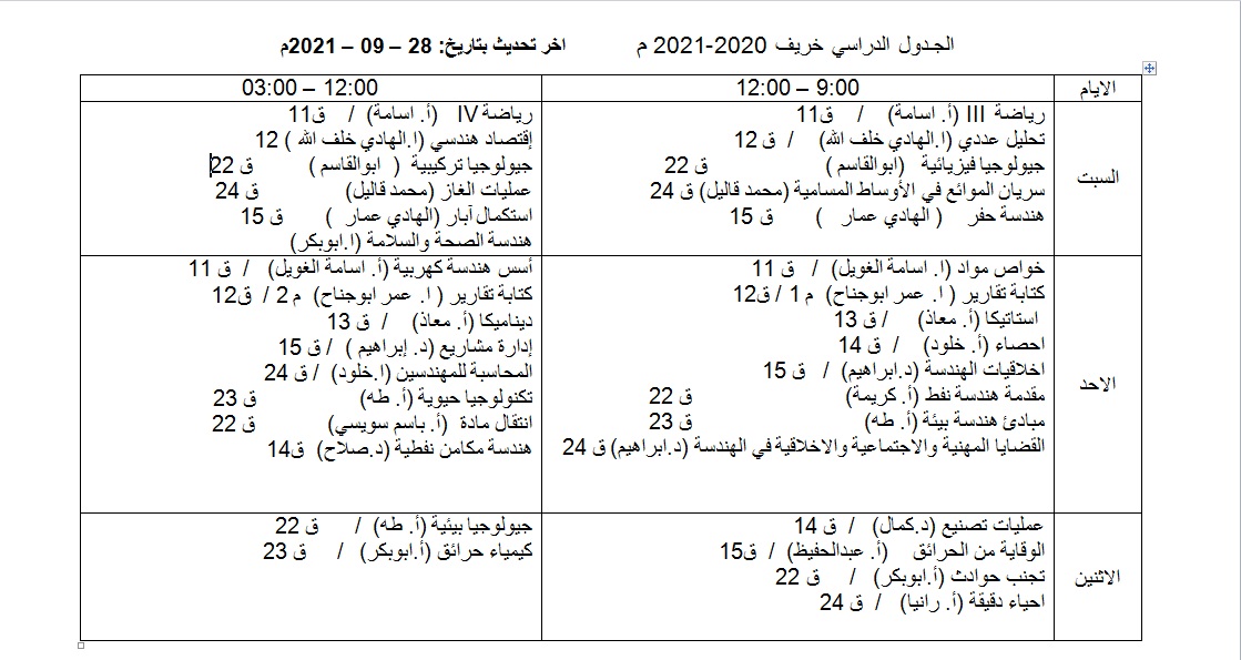 جدول الدراسة للفصل خريف 2021-2022م لجميع الاقسام العلمية.