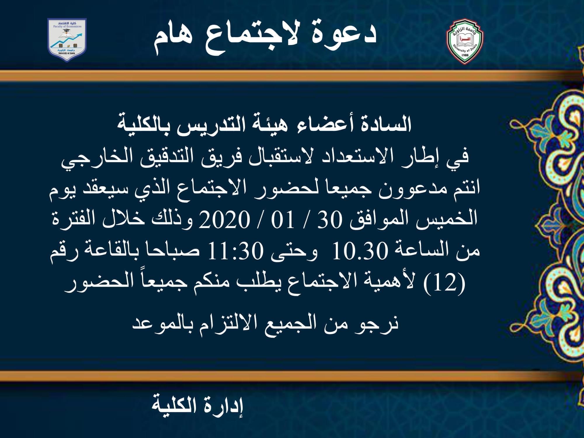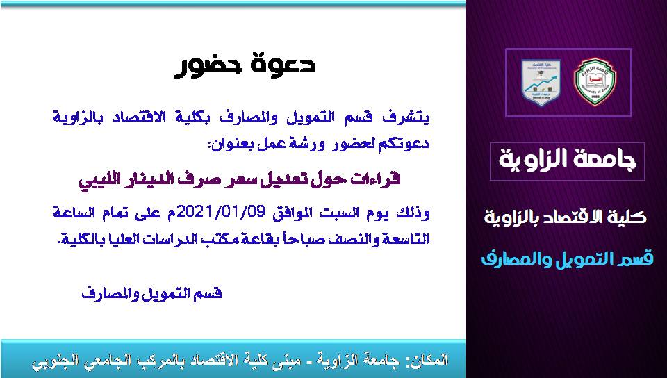 كلية الاقتصاد بالزاوية إحدى كليات جامعة الزاوية التي أنشئت في العام 2001 م بمقرها الأول الكائن بمنطقة الحرشة قبل أن تنتقل في عام 2011 م إلى مقرها الجديد بالمركب الجامعي لجامعة الزاوية، وتستهدف الكلية تأهيل الكفاءات العلمية المتخصصة وتخريج الكوادر البشرية لخدمة المجتمع في كافة مجالات العلوم الاقتصادية والمالية والإدارية في مرحلتي الدراسات الجامعية والدراسات العليا، وتهتم بالدراسات والبحوث العلمية النظرية والتطبيقية وتشجعها للمساهمة في حل المشكلات الاقتصادية المحلية للدفع بعجلة التقدم والنمو الاقتصادي وتحقيق الرفاهية الاجتماعية.