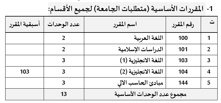1-المقررات الأساسية (متطلبات الجامعة) لجميع الأقسام 1-المقررات الأساسية (متطلبات الجامعة) لجميع الأقسام