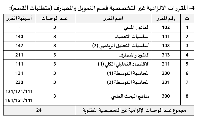 4- المقررات الإلزامية غير التخصصية قسم التمويل والمصارف (متطلبات القسم) 4- المقررات الإلزامية غير التخصصية قسم التمويل والمصارف (متطلبات القسم)