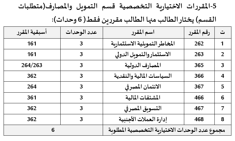 5-المقررات الاختيارية التخصصية قسم التمويل والمصارف(متطلبات القسم) 5-المقررات الاختيارية التخصصية قسم التمويل والمصارف(متطلبات القسم)