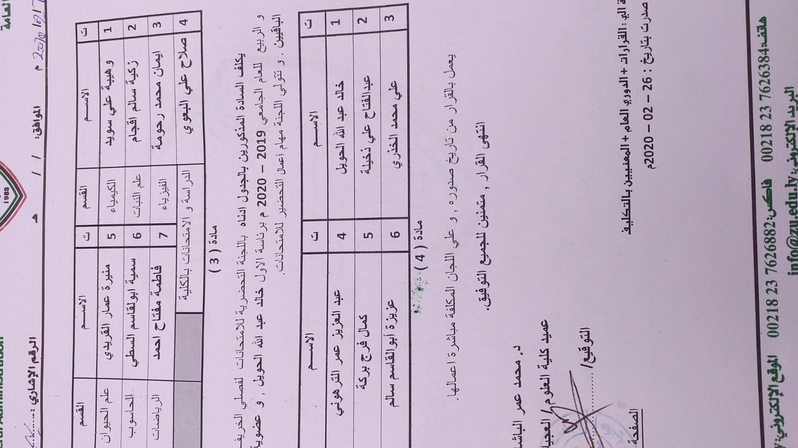 قرار تشكيل لجنة الامتحانات بكلية العلوم بالعجيلات لعام 2020 م
