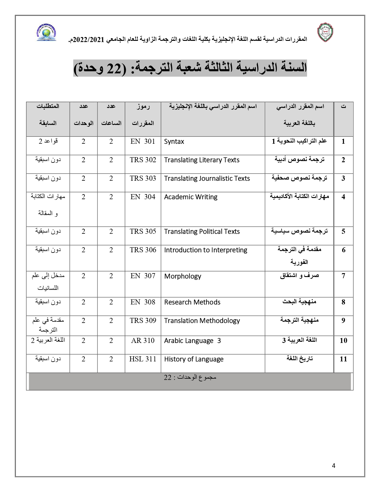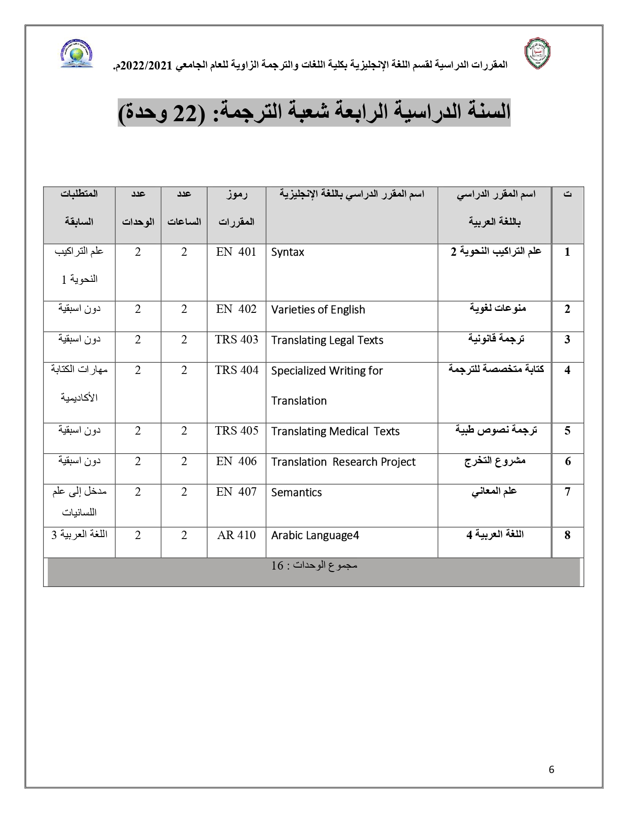 - ربط مقررات القسم بشكل عام و شعبة الترجمة بشكل خاص باحتياجات سوق العمل و متطلبات التنمية.