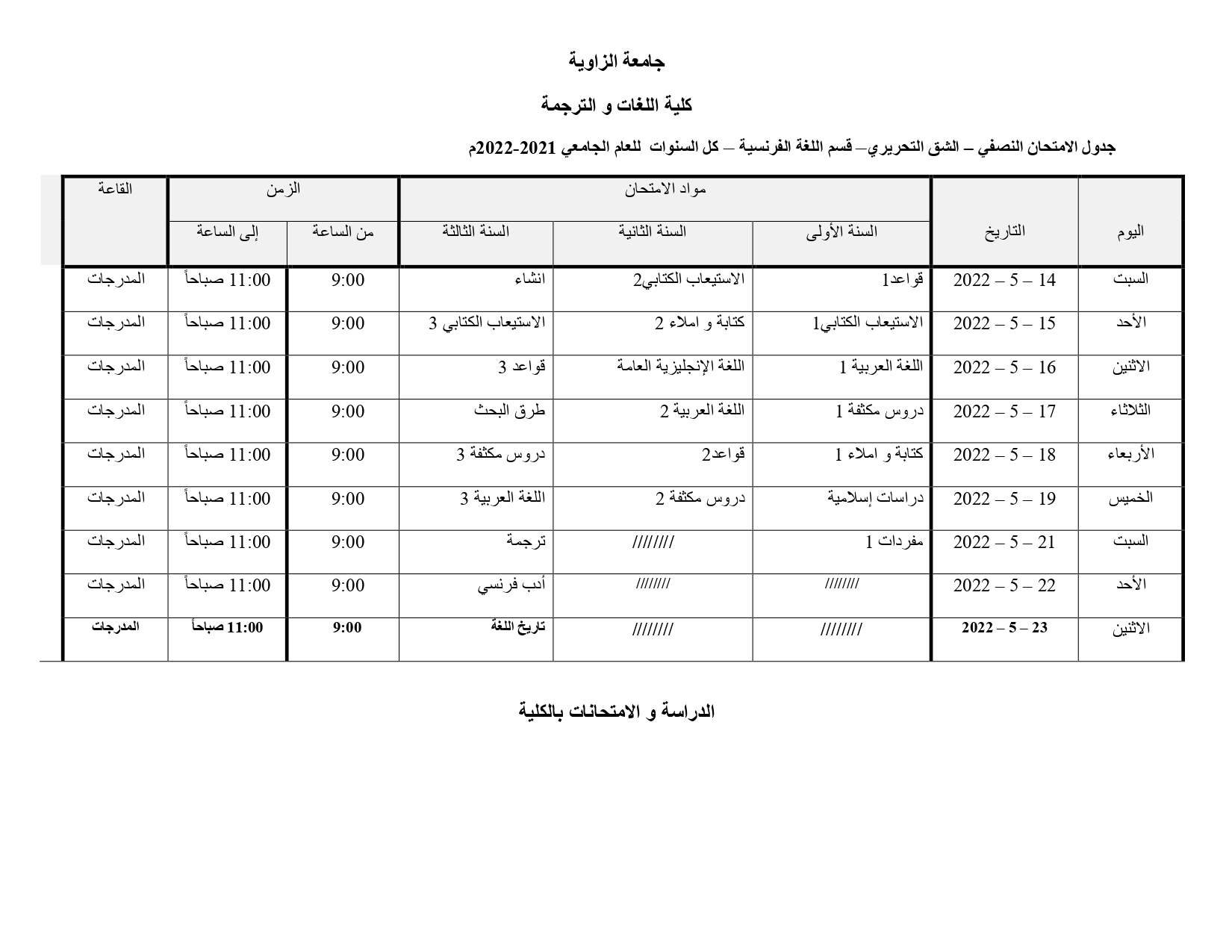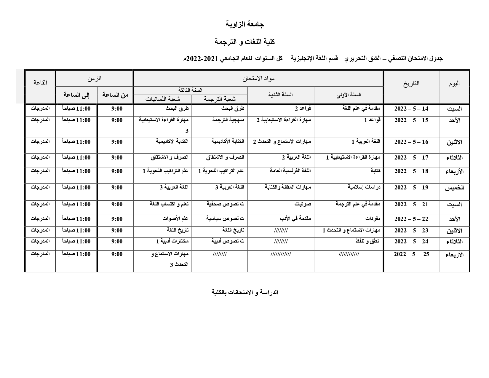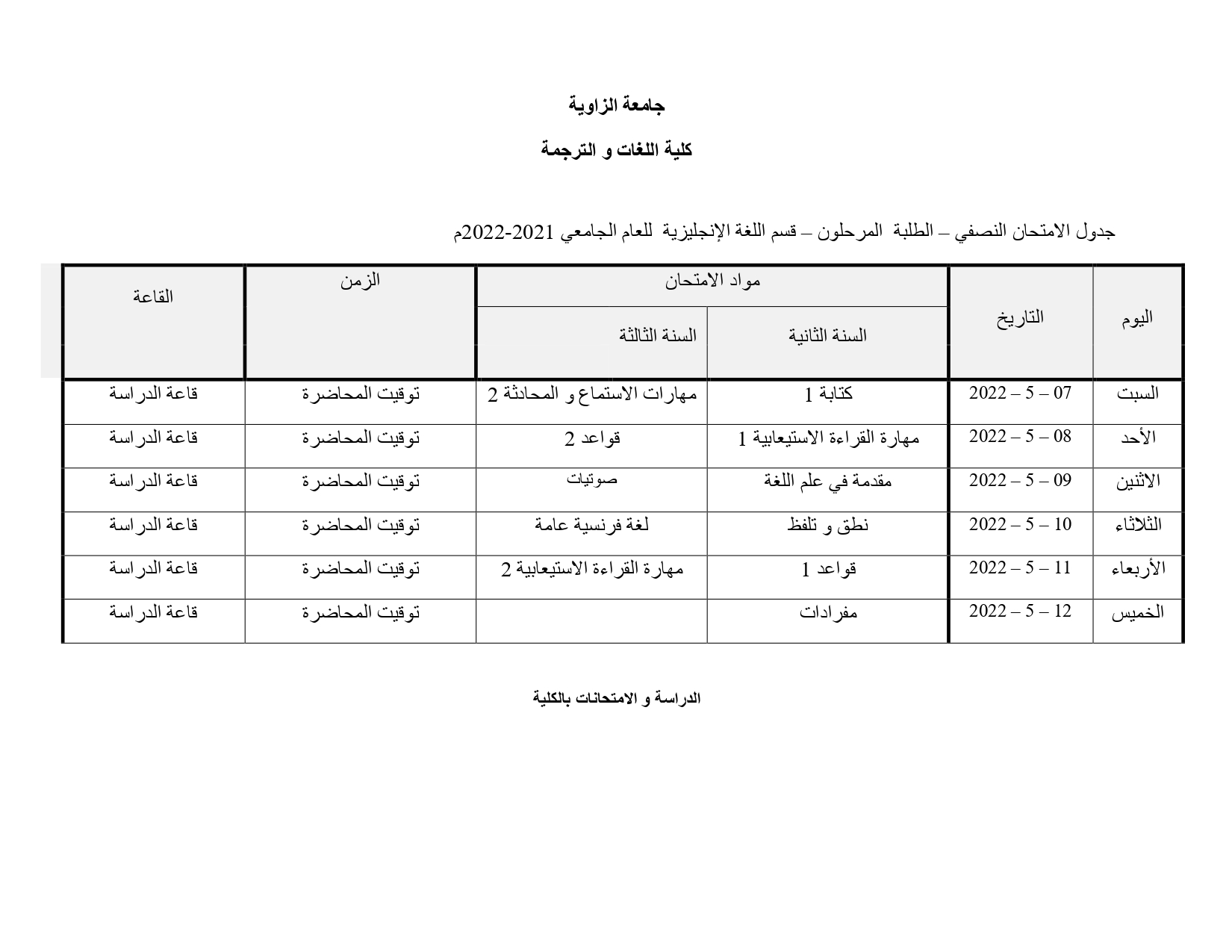 جداول الامتحانات النصفية والترحيل لكلية اللغات والترجمة