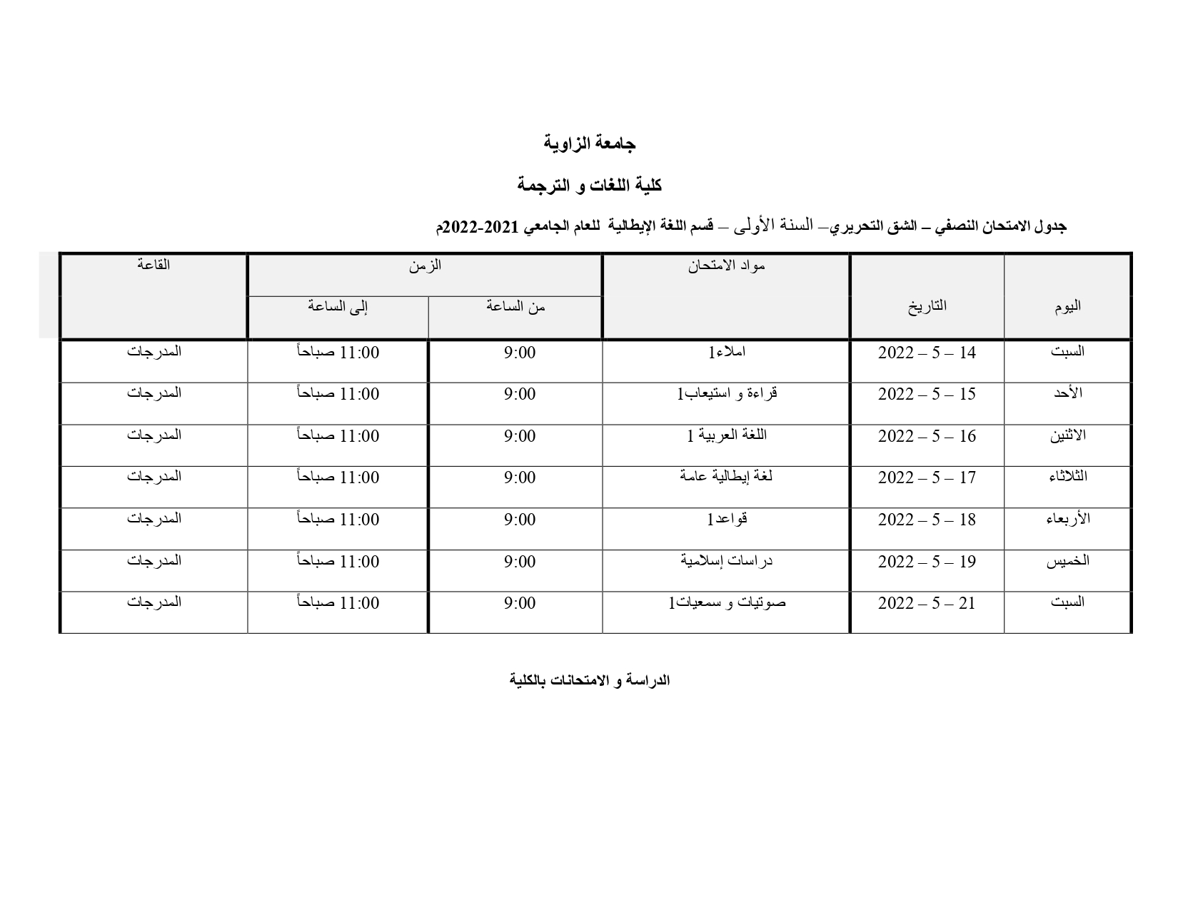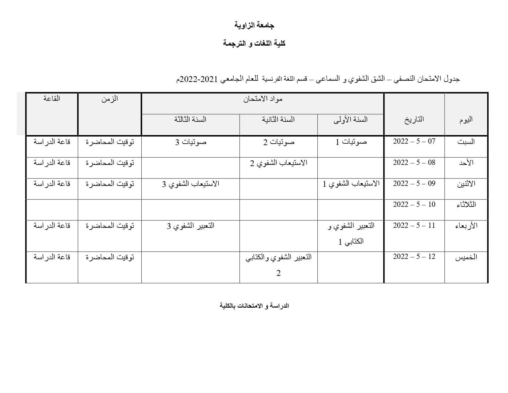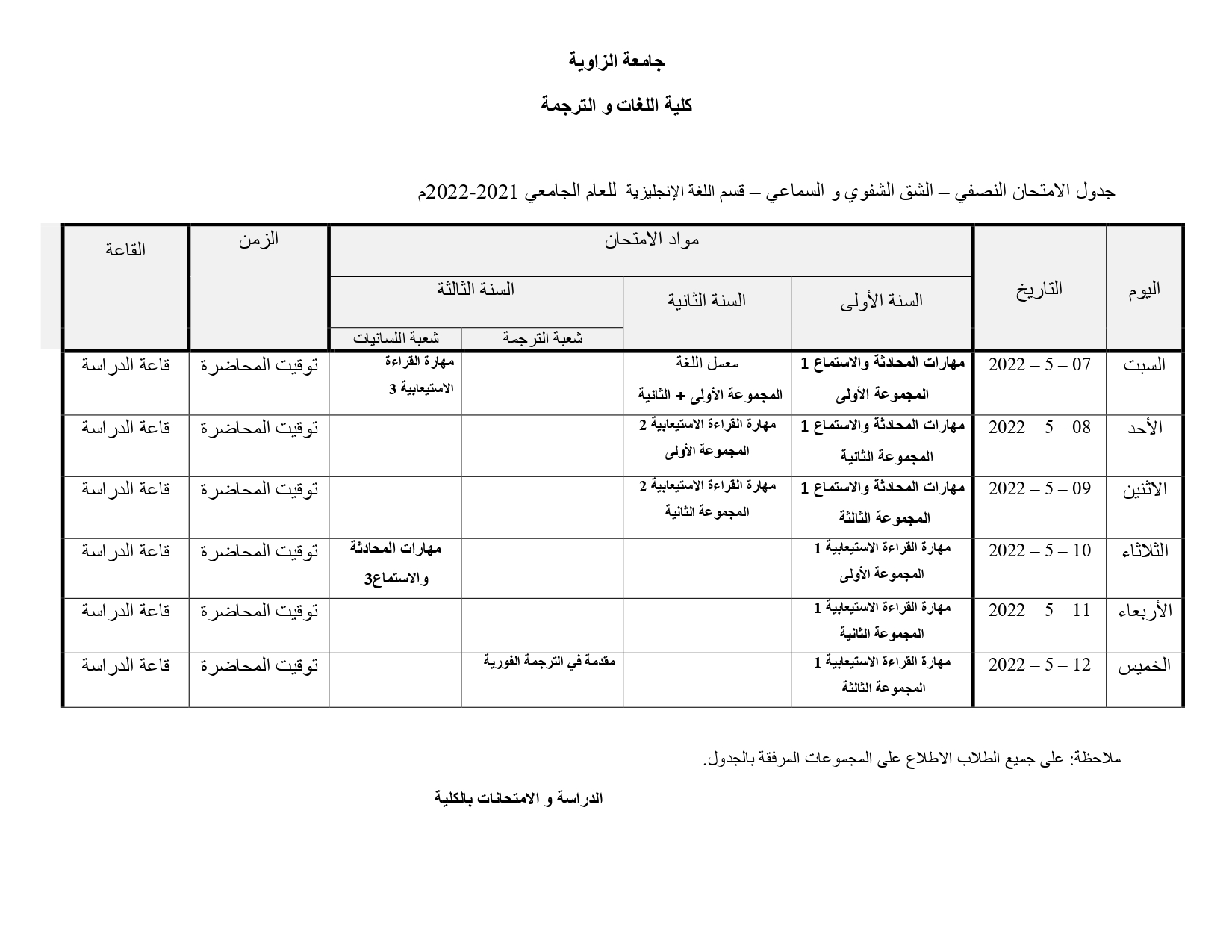 جداول الامتحانات النصفية والترحيل لكلية اللغات والترجمة