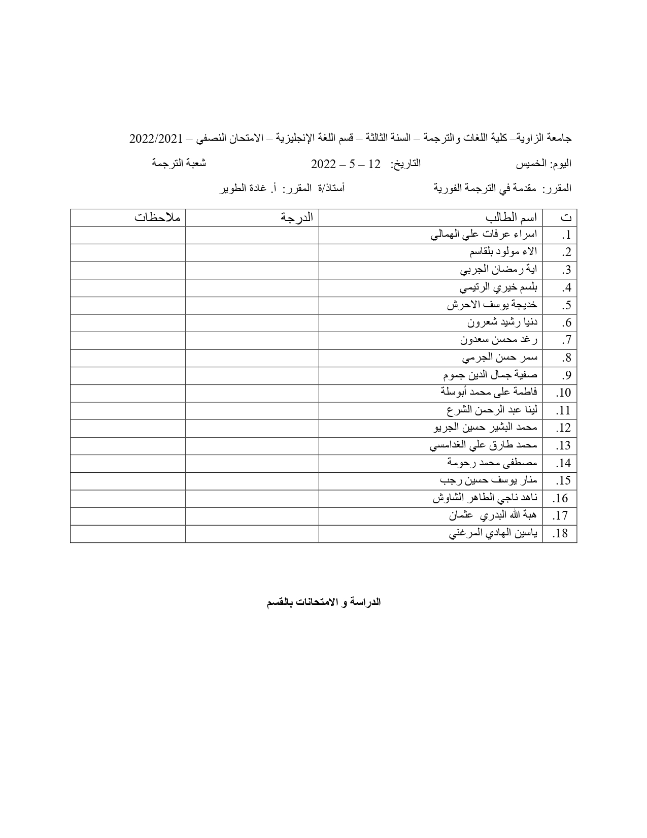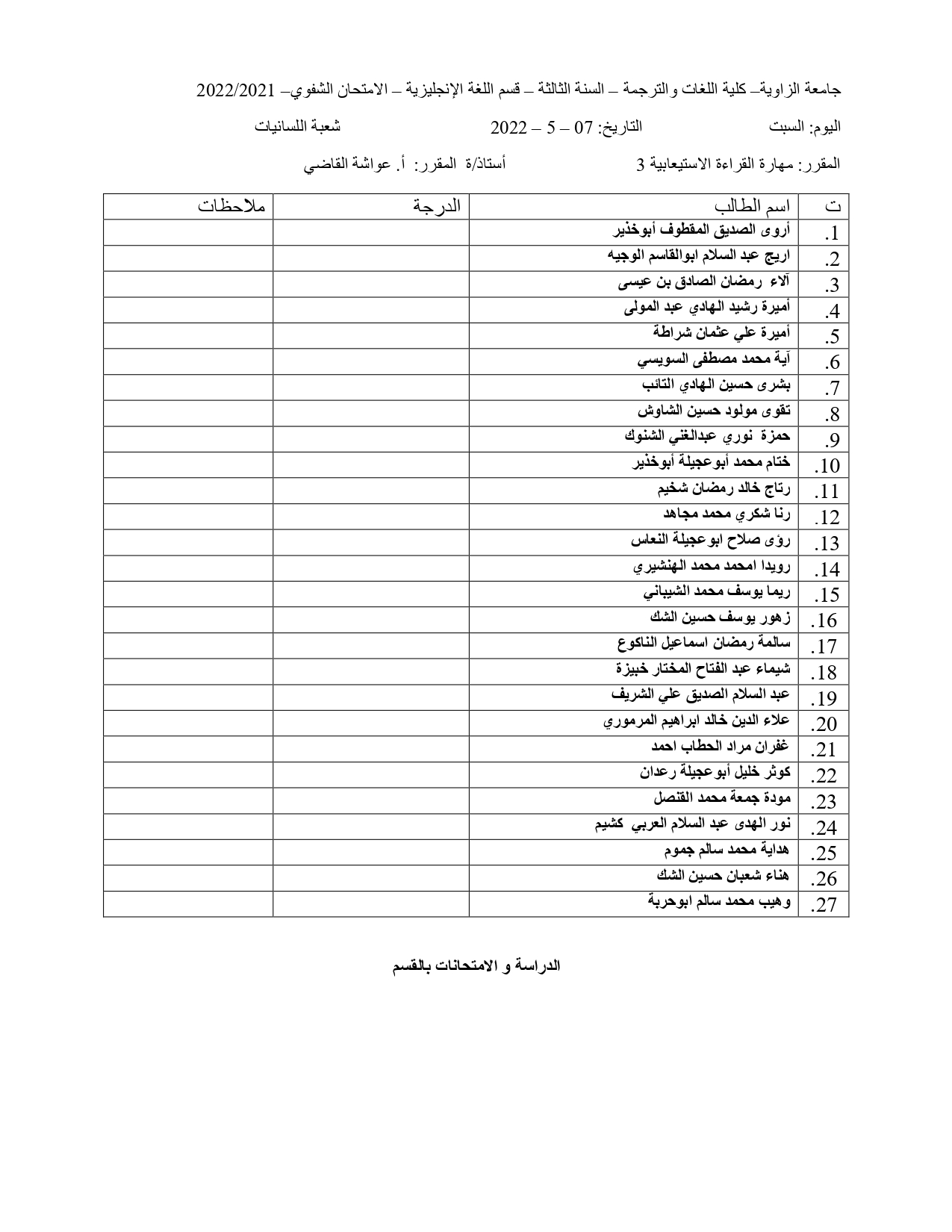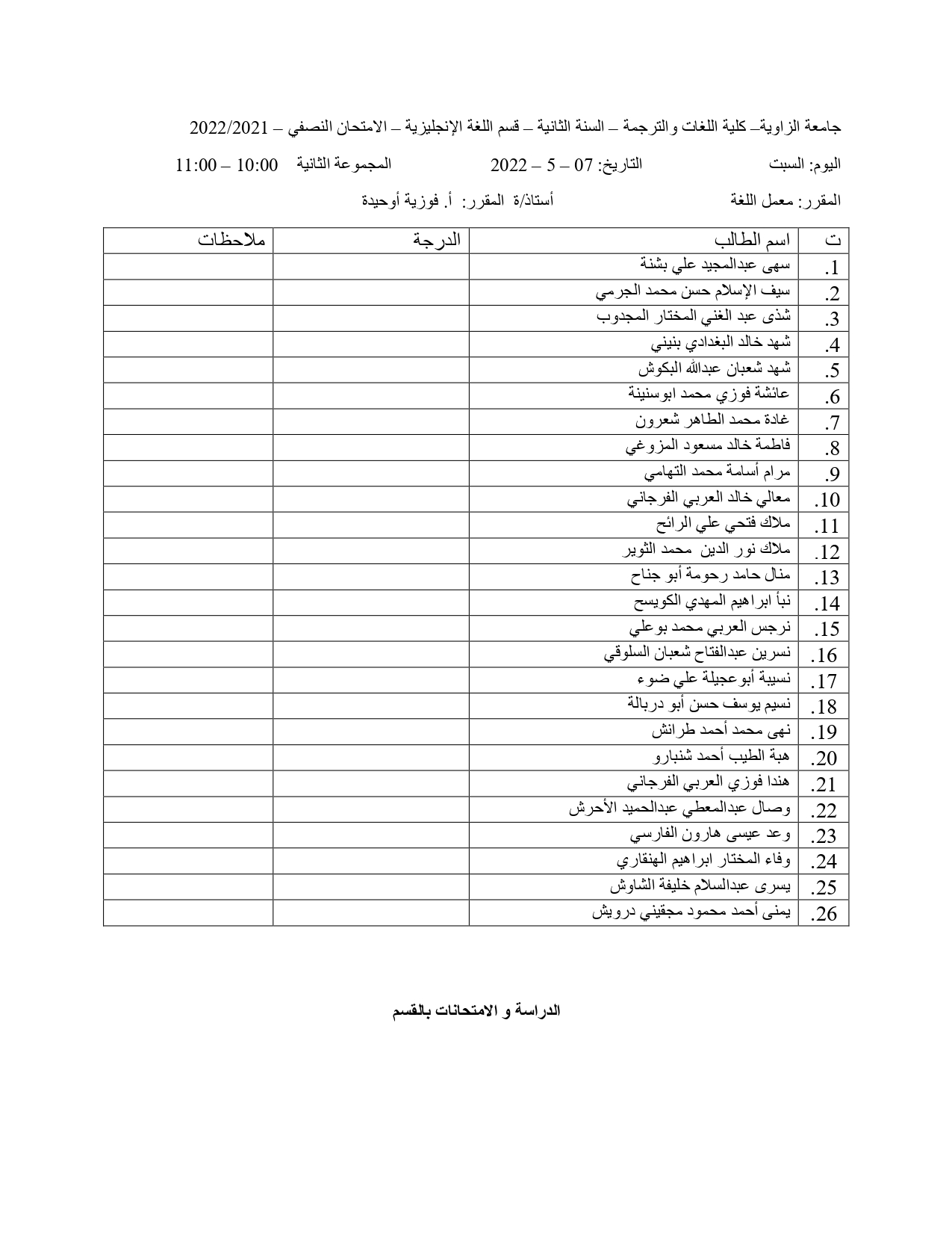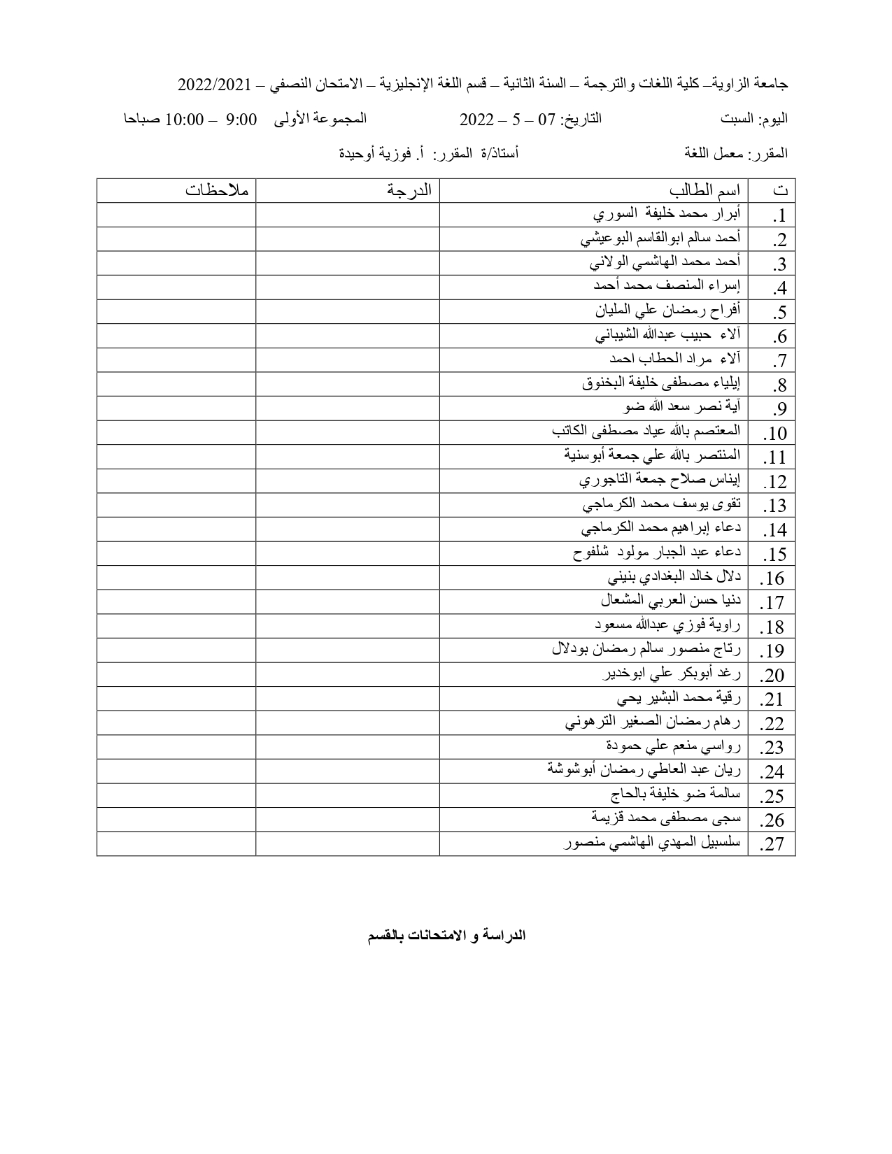 توزيع الطلبة في الامتحان الشفوي و السماعي