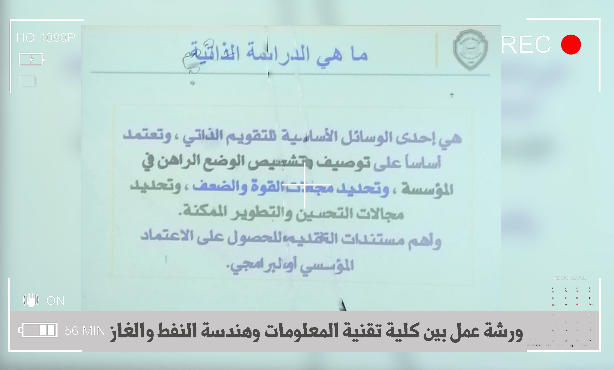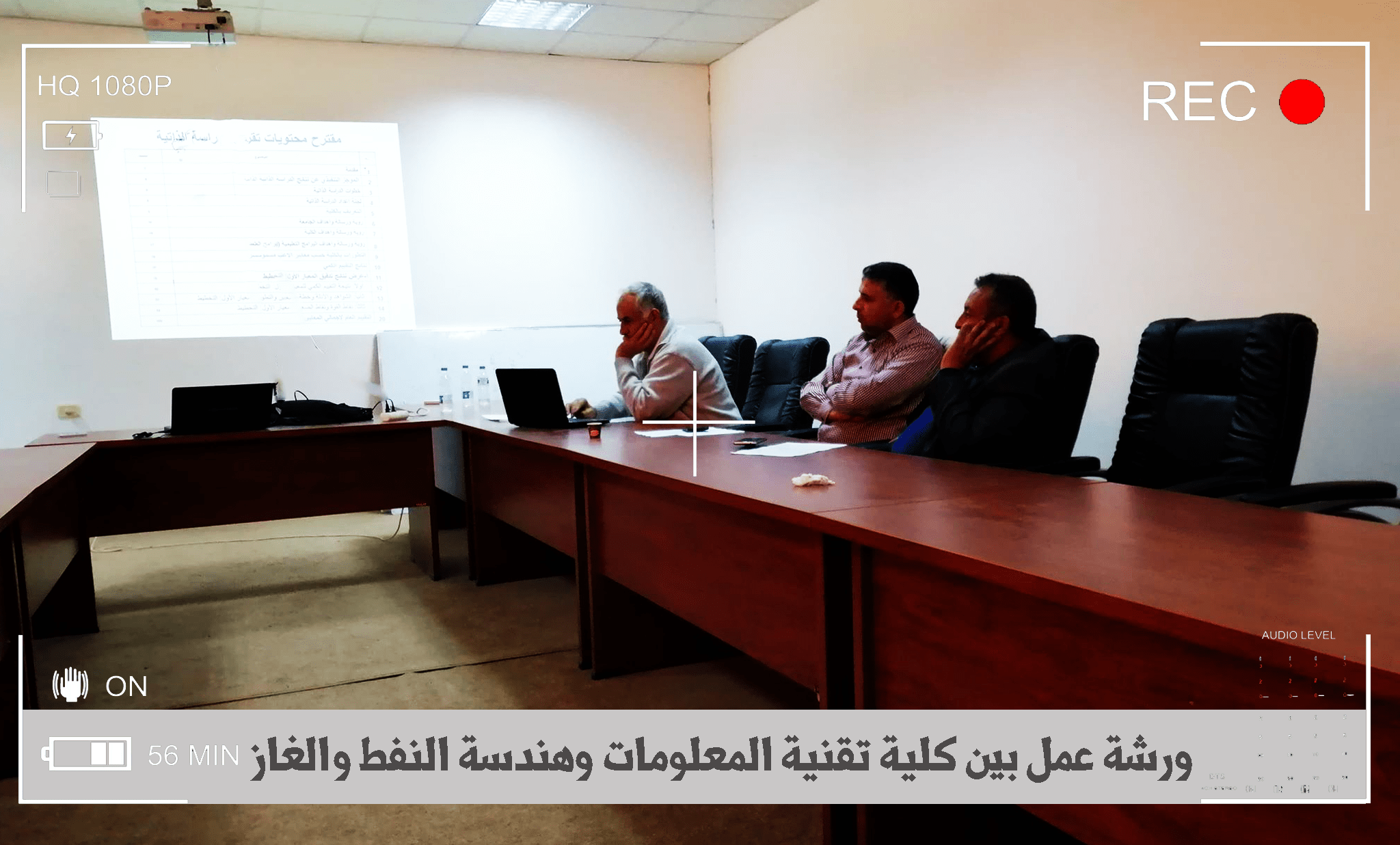 أقيمت يوم الأربعاء الموافق 04 ديسمبر 2019 بقاعة الدراسات العليا بكلية هندسة النفط والغاز ورشة عمل بين كليتي تقنية المعلومات وهندسة النفط والغاز، وبحضور عميد كلية تقنية المعلومات ومدير مكتب الجودة بالكلية وعميد كلية هندسة النفط والغاز ولفيف من أعضاء هيئة التدريس بالكليتين.