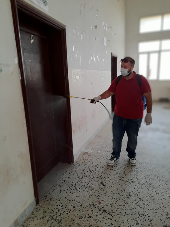 حرصا من ادارة الكلية لاستكمال الفصل الدراسي والمحافظة على صحة الطلبة والعاملين بالكلية قامت بالتواصل مع البلديات المجاورة لتوفير المستلزمات الوقائية لمكافحة جائحة فيروس كورونا نظرا لنقص توفرها بمخازن الجامعة . و بعد الحصول على كمية محدودة من مواد التعقيم والتطهير والقفازات والكمامات انطلقت يوم االسبت الموافق 18/07/2020 م الامتحانات العملية بالكلية. حيث تم توزيع الكمامات على الطلبة واعضاء هيئة التدريس و العاملين بالكلية . ولتعقيم مبنى الكلية قام العاملون بمكتب الشؤون الادارية والمالية بالكلية  برش المكاتب والممرات وقاعات الامتحانات بمواد التعقيم والتطهير.