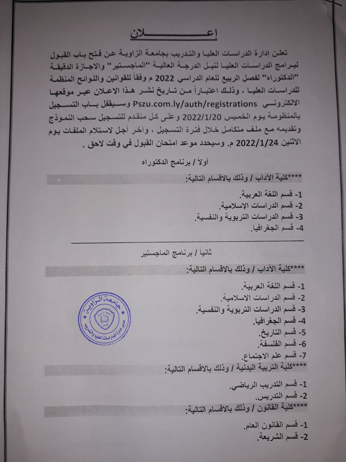 تعلن ادارة الدراسات العليا و التدريب بجامعة الزاوية عن فتح باب القبول لبرنامج الدراسات العليا لنيل الدرجة العالية "الماجستير" و الاجازة الدقيقة "الدكتوراه" لفصل الربيع للعام الدراسي 2021-2022م وفقاً للقوانيين واللوائح المنظمة للدراسات العليا، وذلك عبر موقعها الالكتروني التالي:
