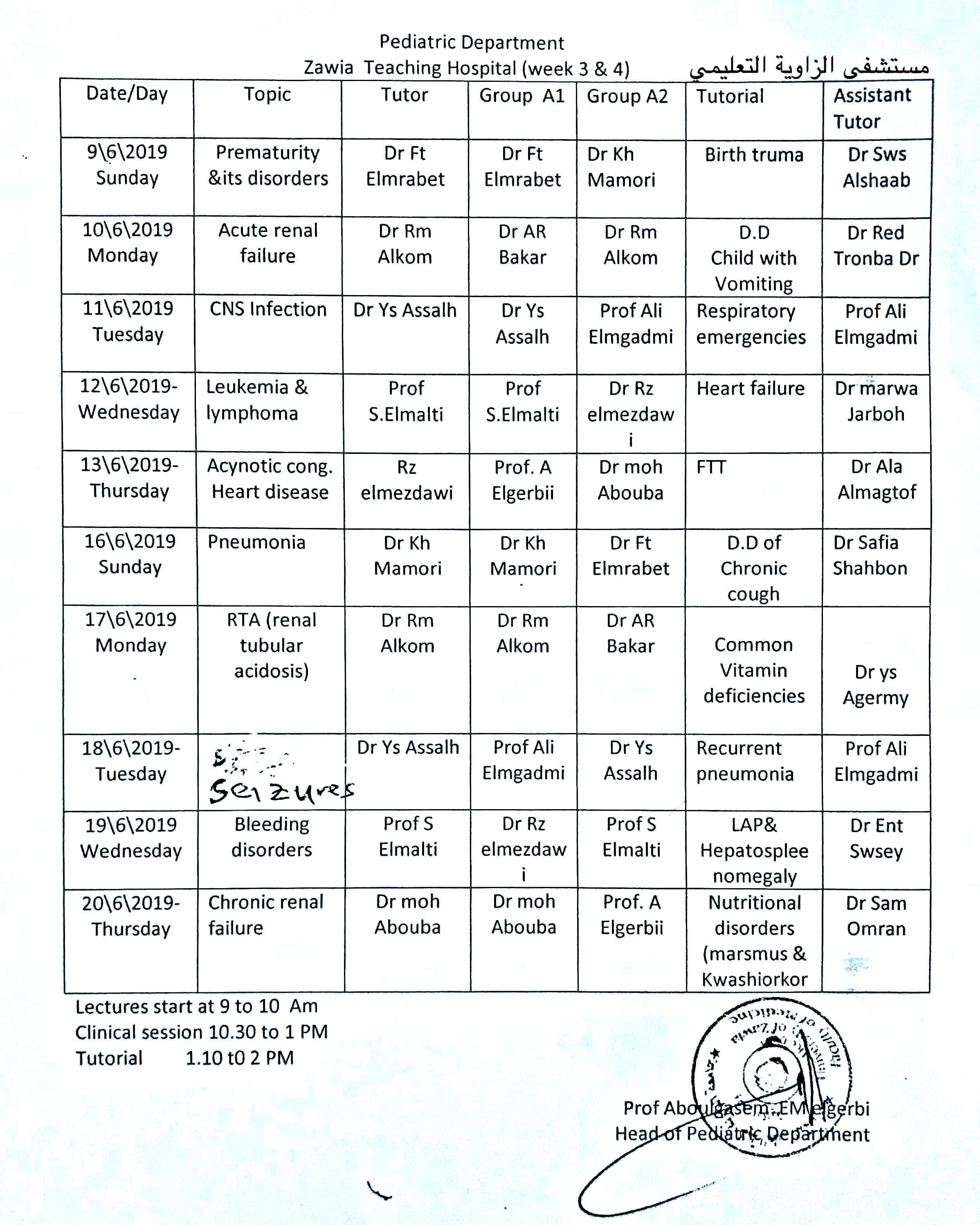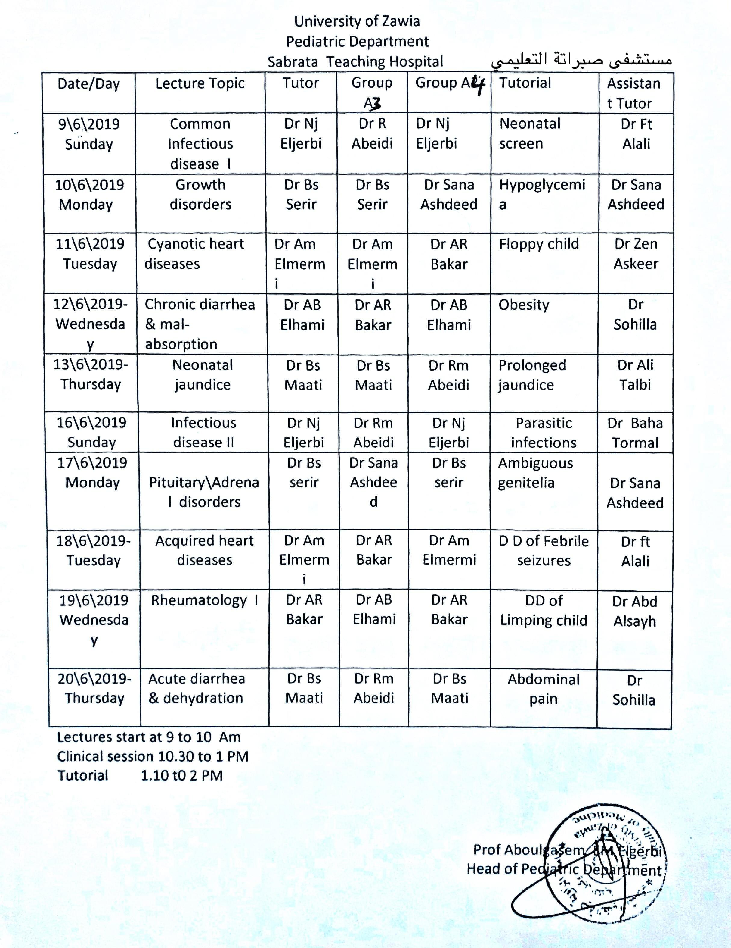 جدول محاضرات مادة الأطفال للسنة الخامسة طب بشري