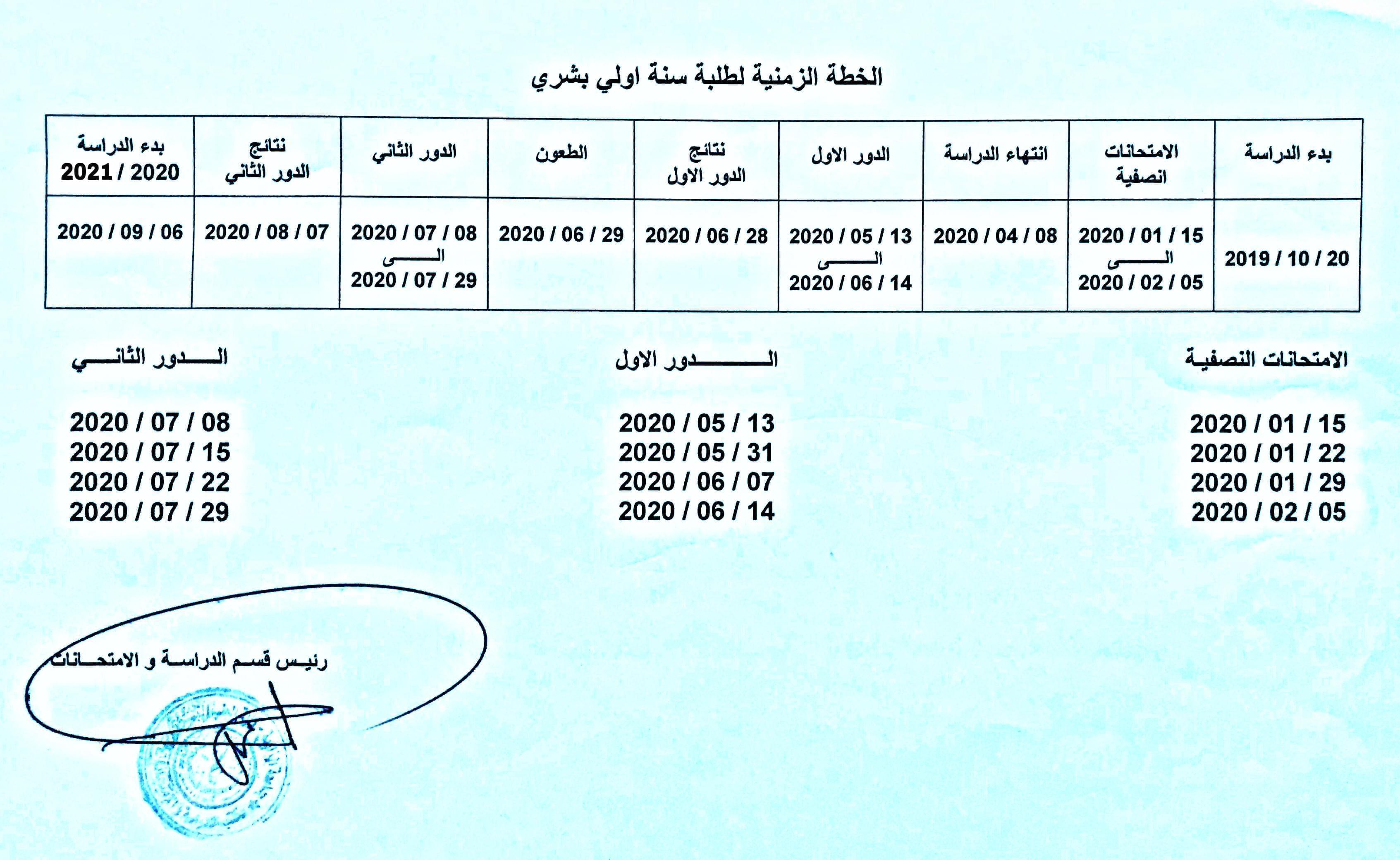 الجدول الدراسي والخطة الدراسية لسنة أولى طب بشري للعام الجامعي 2019-2020