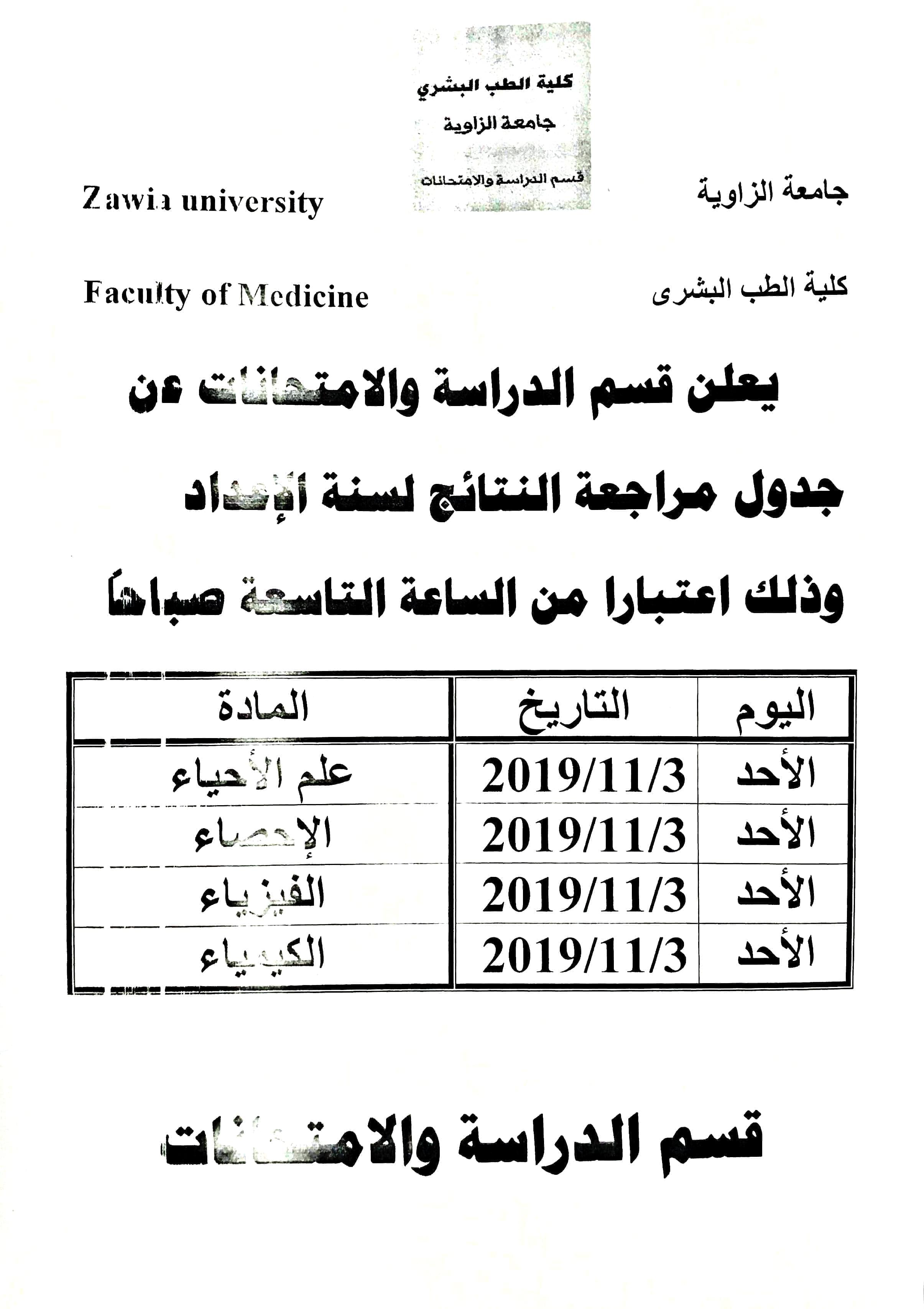 موعد تقديم طلبات مراجعة نتائج الدور الثاني لسنوات الإعداد والأولى والرابعة طب بشري ومرفقة بجداول مراجعة المواد لسنة الإعداد والأولى طب بشري