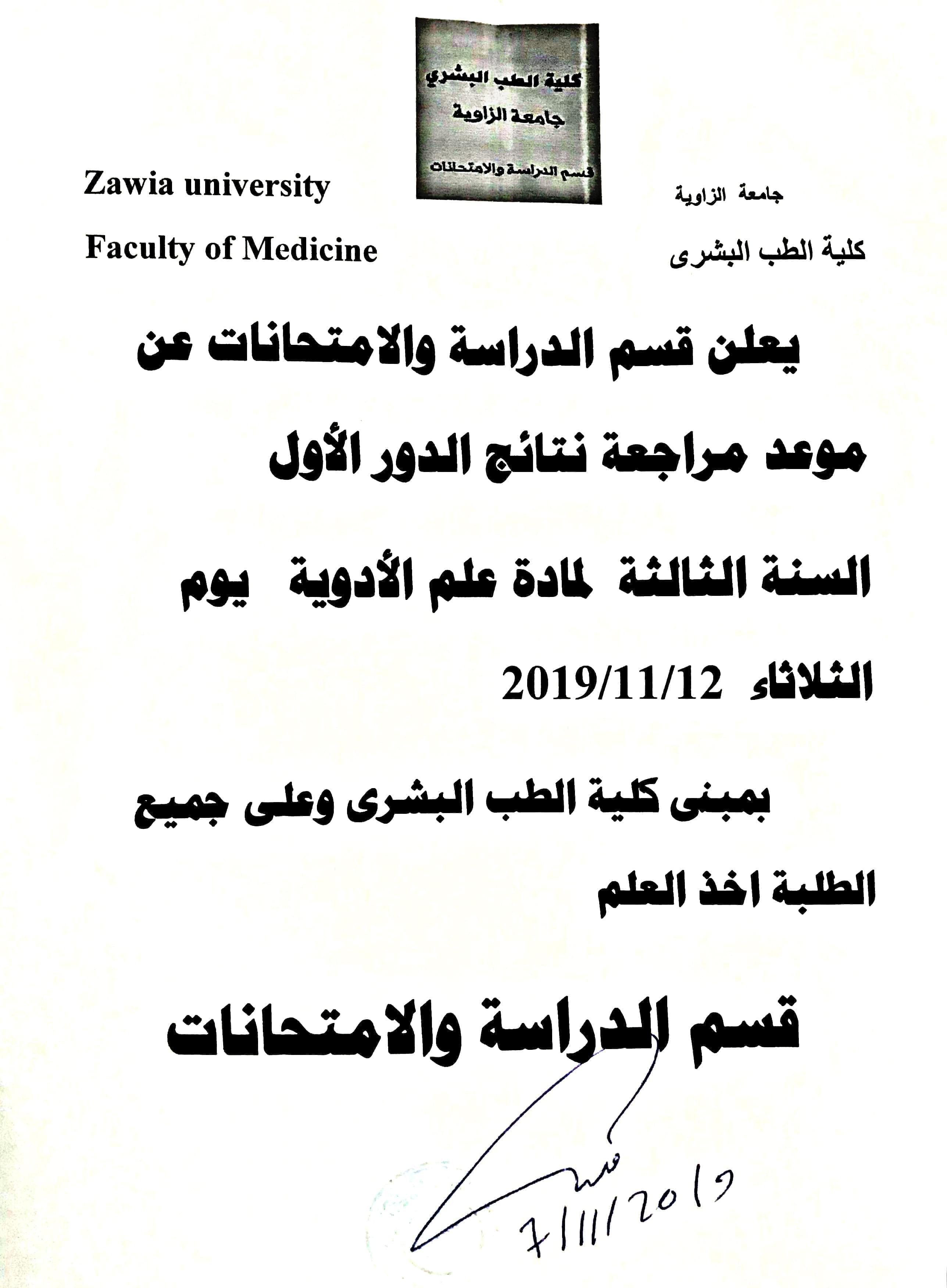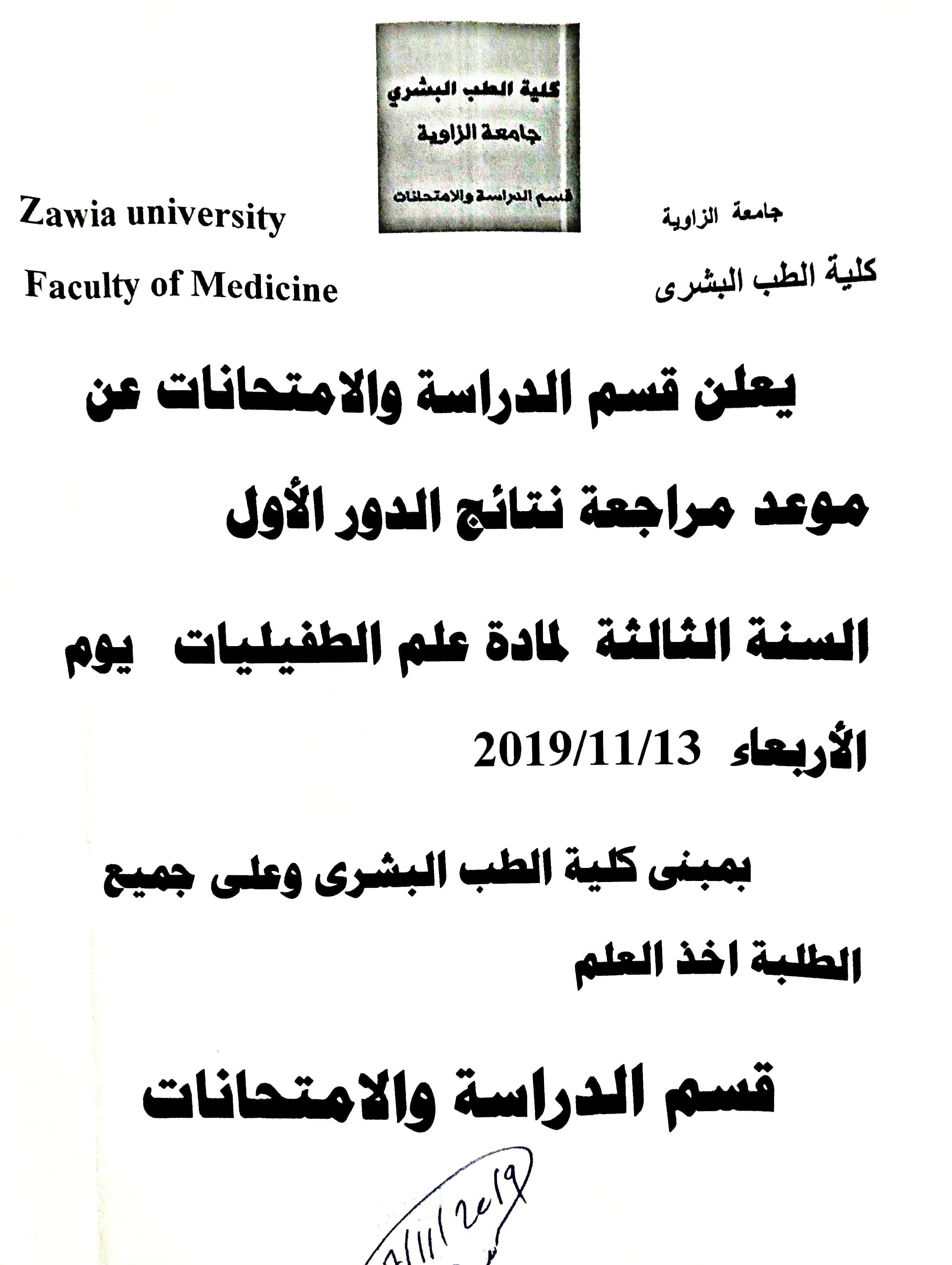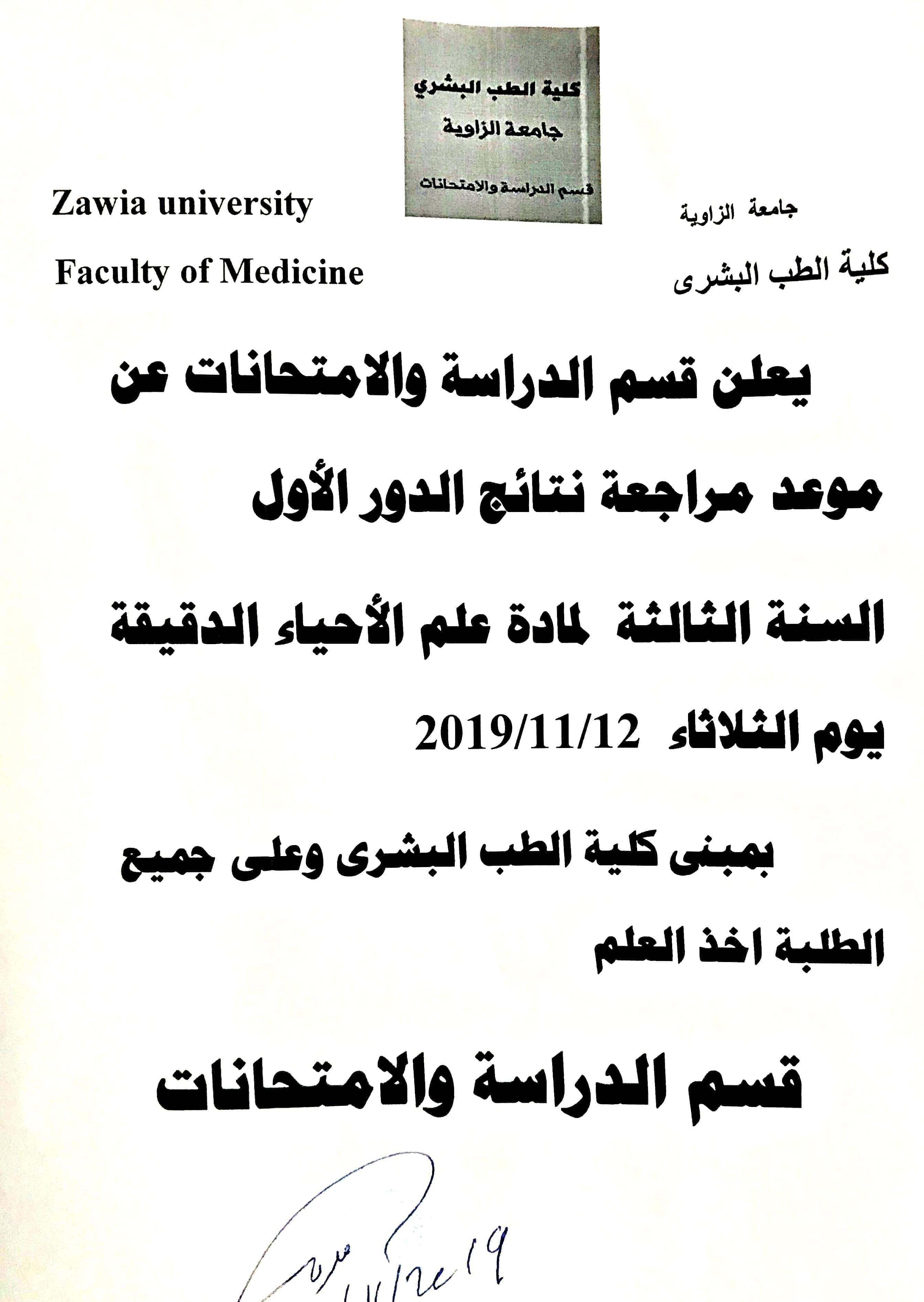 مواعيد مراجعة نتائج الدور الأول للسنة الثالثة طب بشري.