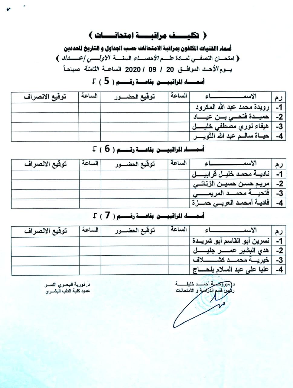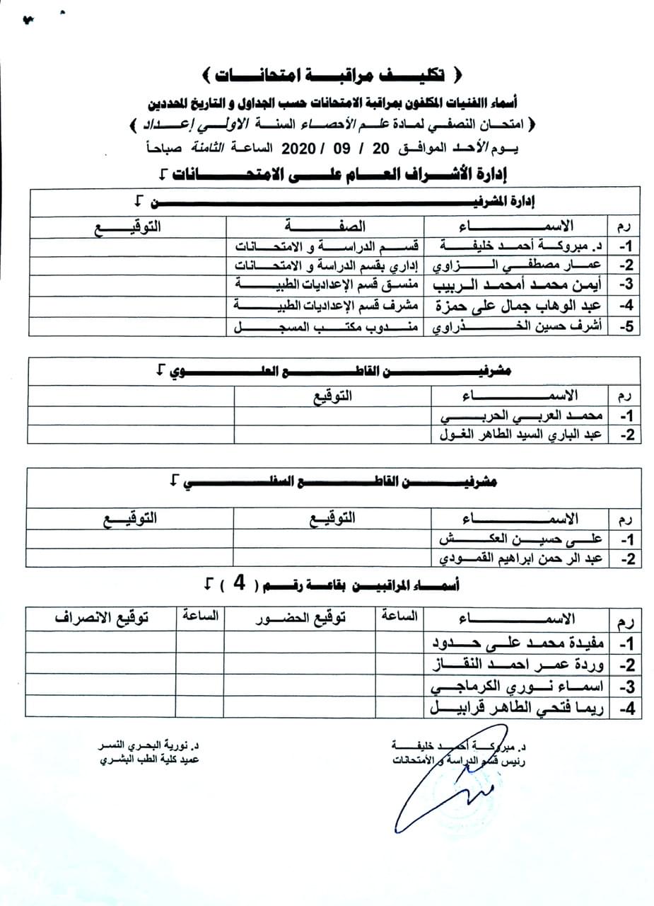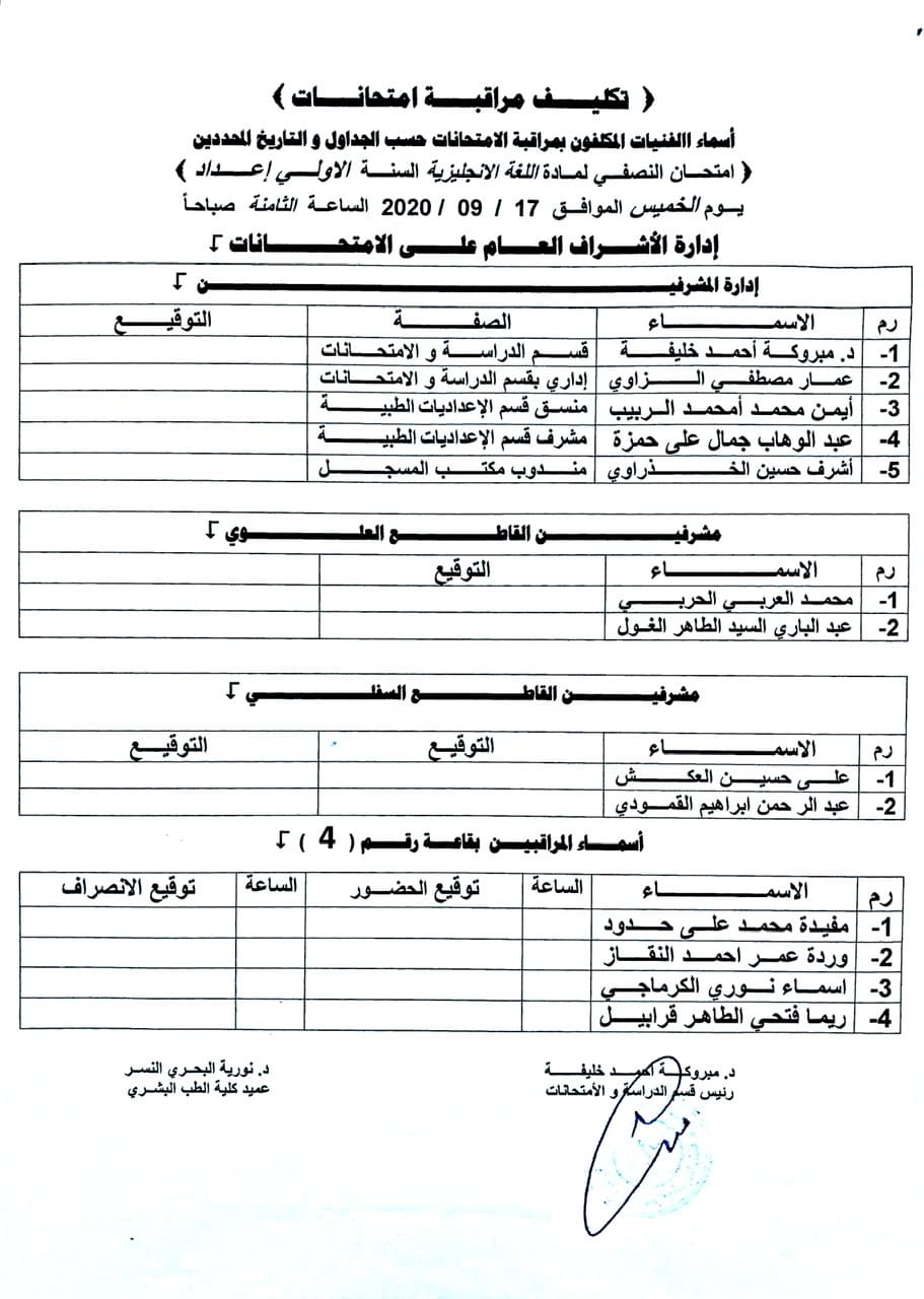 اسماء المكلفين بمراقبة الامتحانات النصفية لسنة الاعداد طب بشري للعام الجامعي 2019-2020.