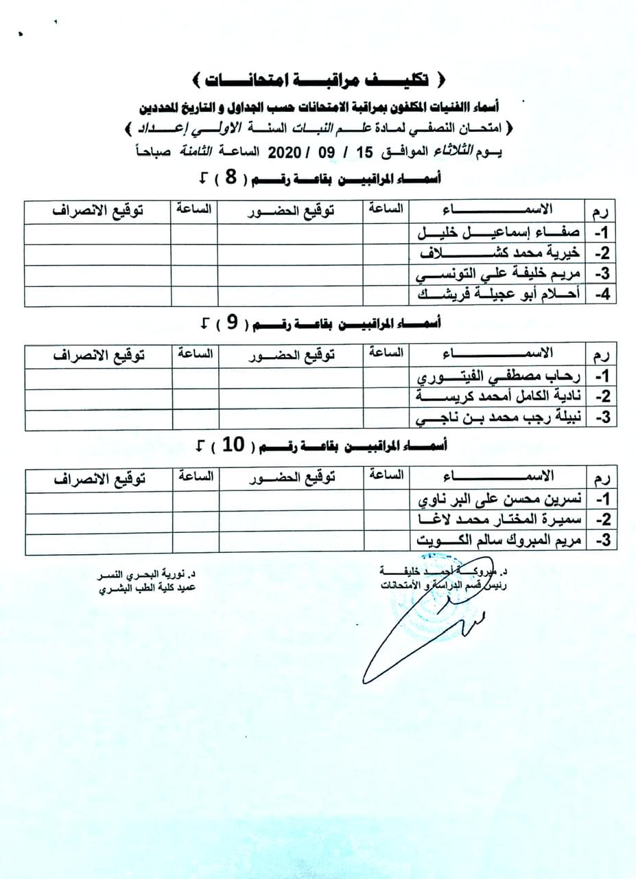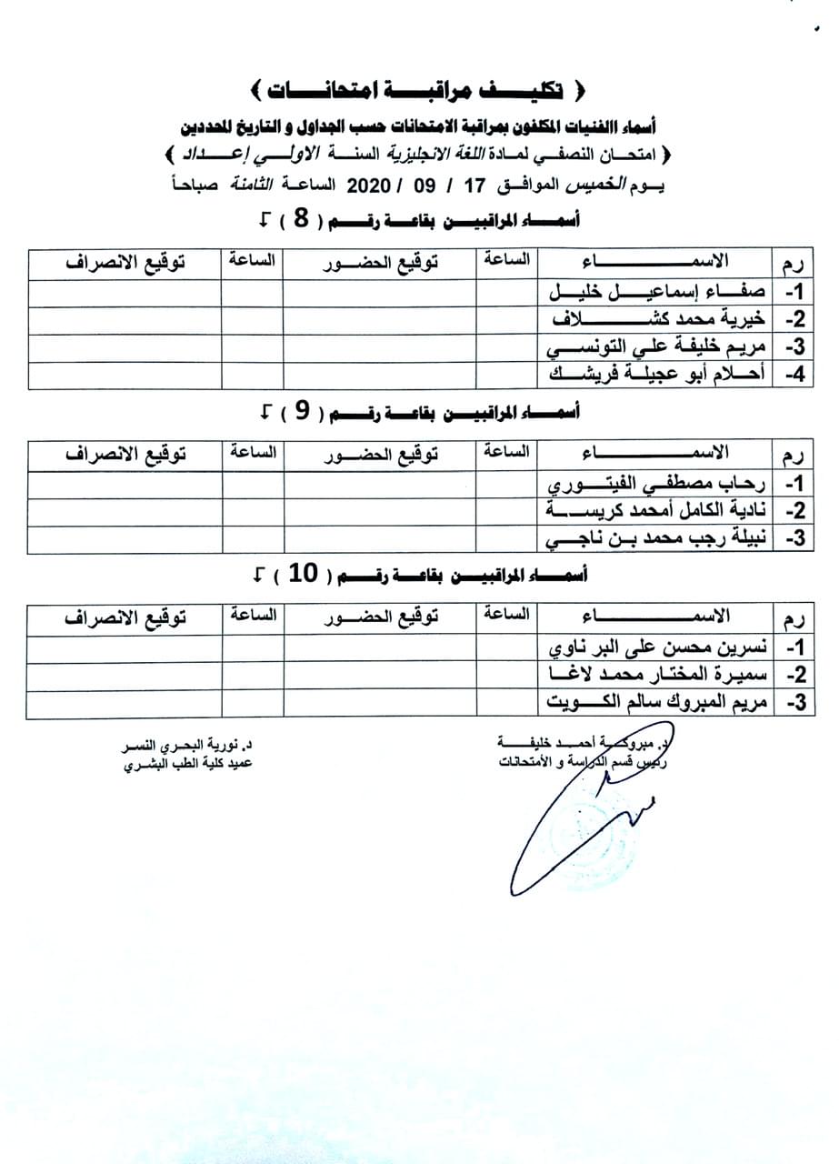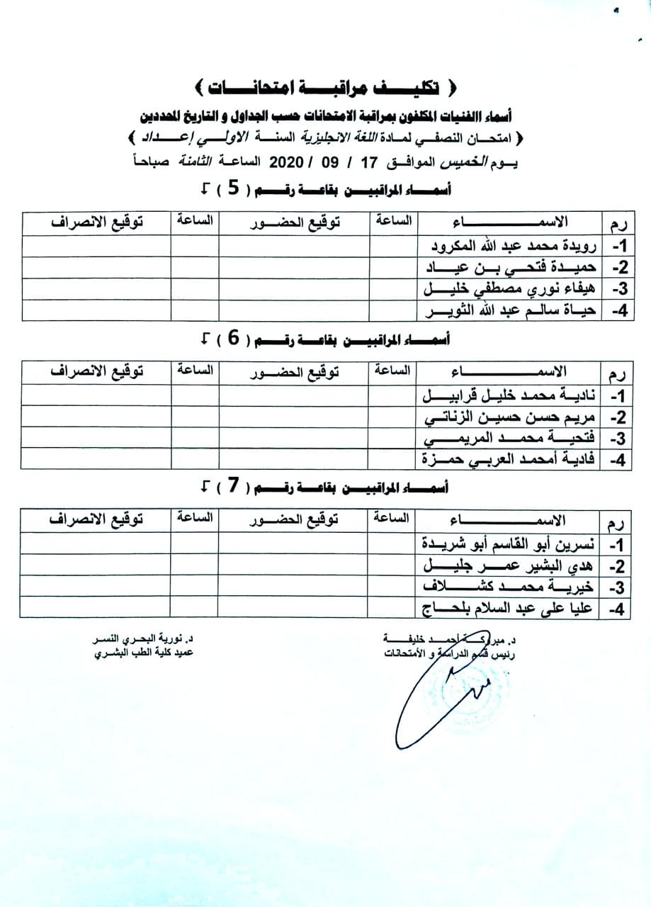 اسماء المكلفين بمراقبة الامتحانات النصفية لسنة الاعداد طب بشري للعام الجامعي 2019-2020.