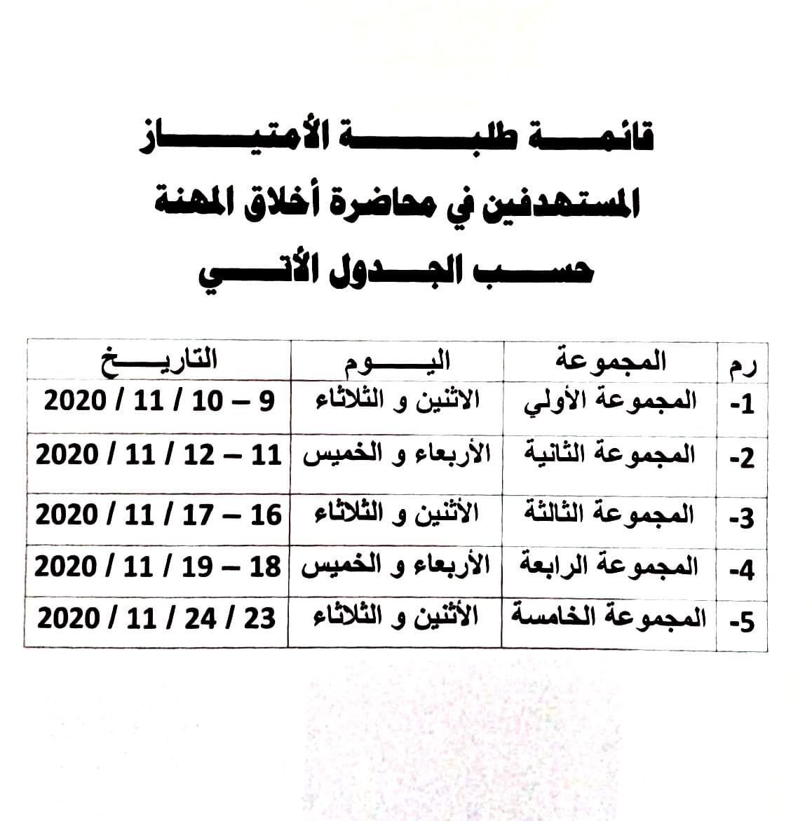 جدول محاضرات بعنوان (أخلاق المهنة)لطلبة الامتياز.