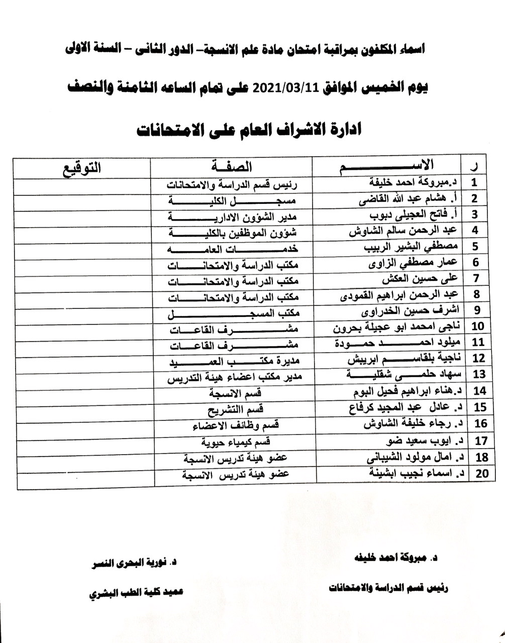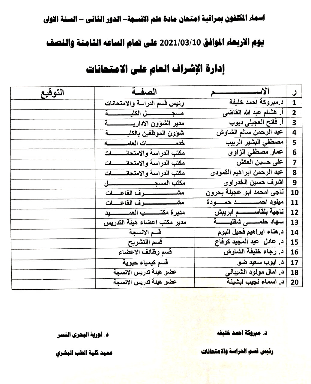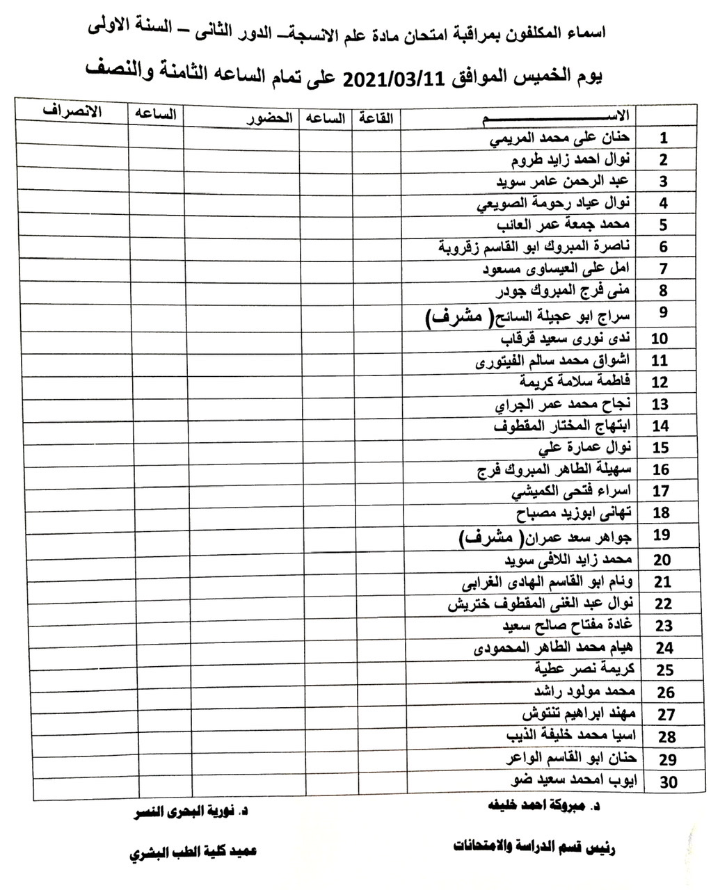 أسماء المكلفين بمراقبة امتحان الدور الثاني للسنة الأولى طب بشري للعام الجامعي 2019-2020