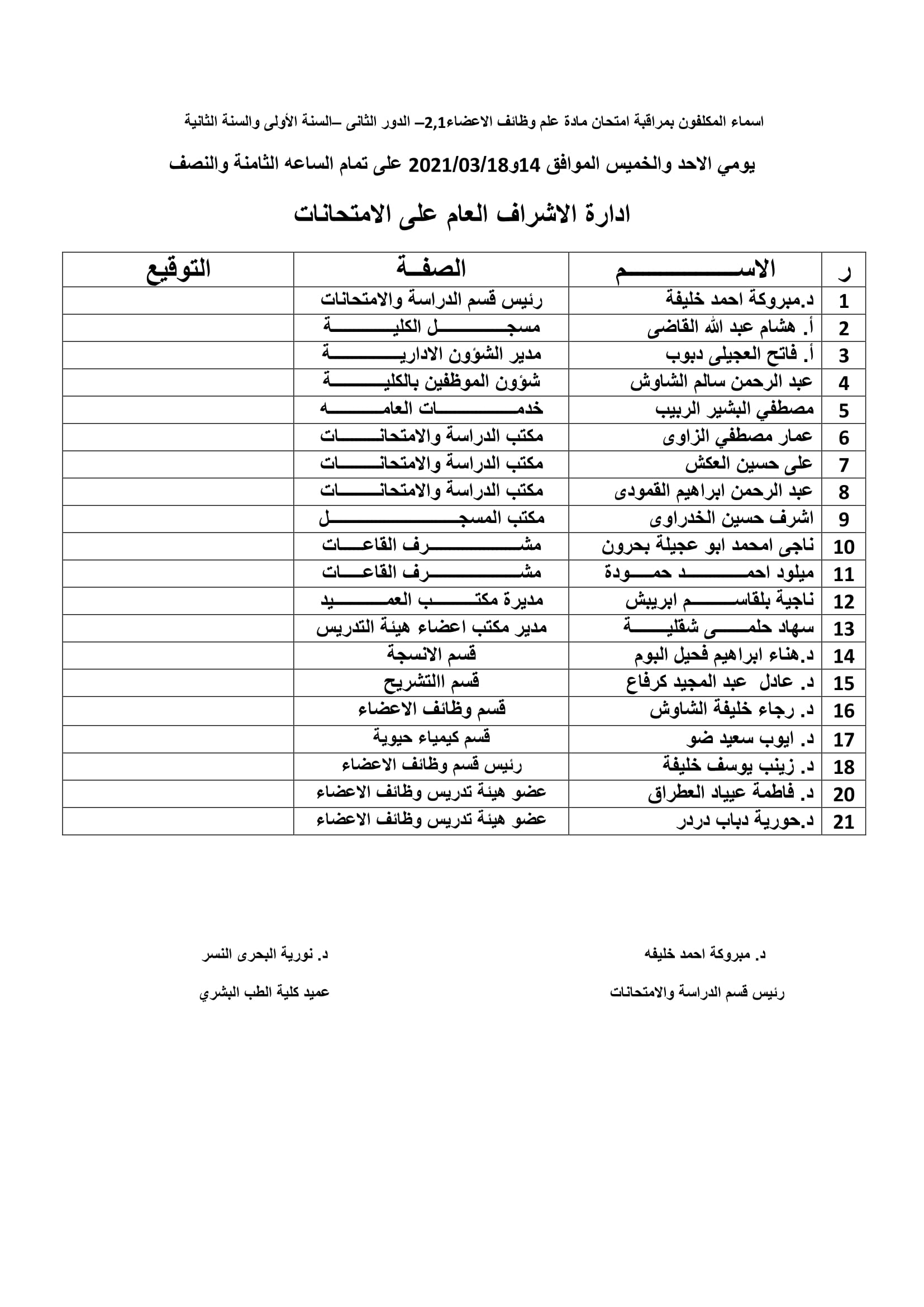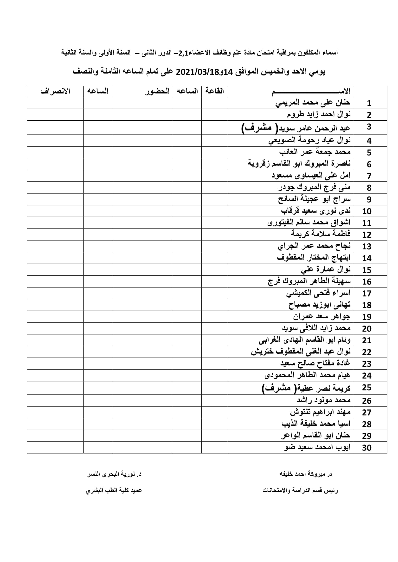 أسماء المكلفين بمراقبة امتحانات الدور الثاني في مادة علم وظائف الأعضاء2,1 للسنة الأولى والثانية طب بشري للعام الجامعي 2019-2020.