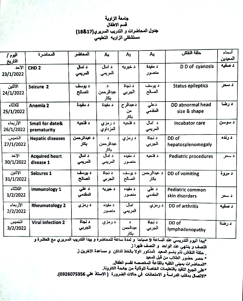 جدول المحاضرات السريرية لمادة الاطفال للسنة الخامسة الدفعة 18،17
