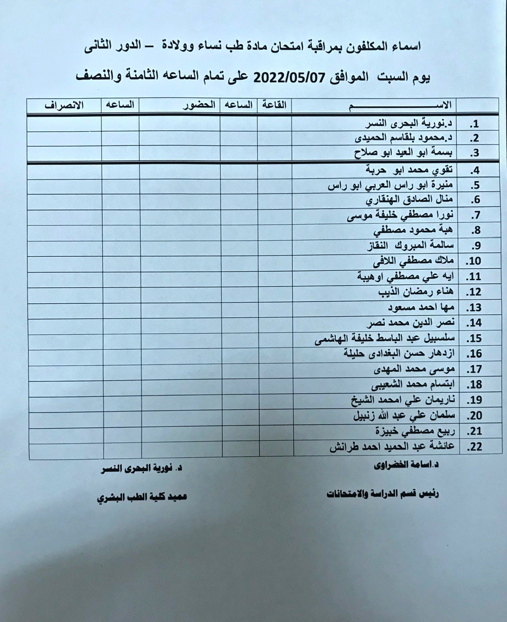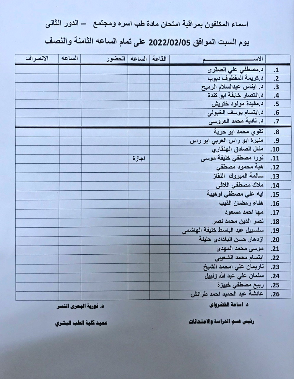 أسماء المكلفين بمراقبة امتحانات الدور الثاني للسنة الرابعة الدفعة 19.