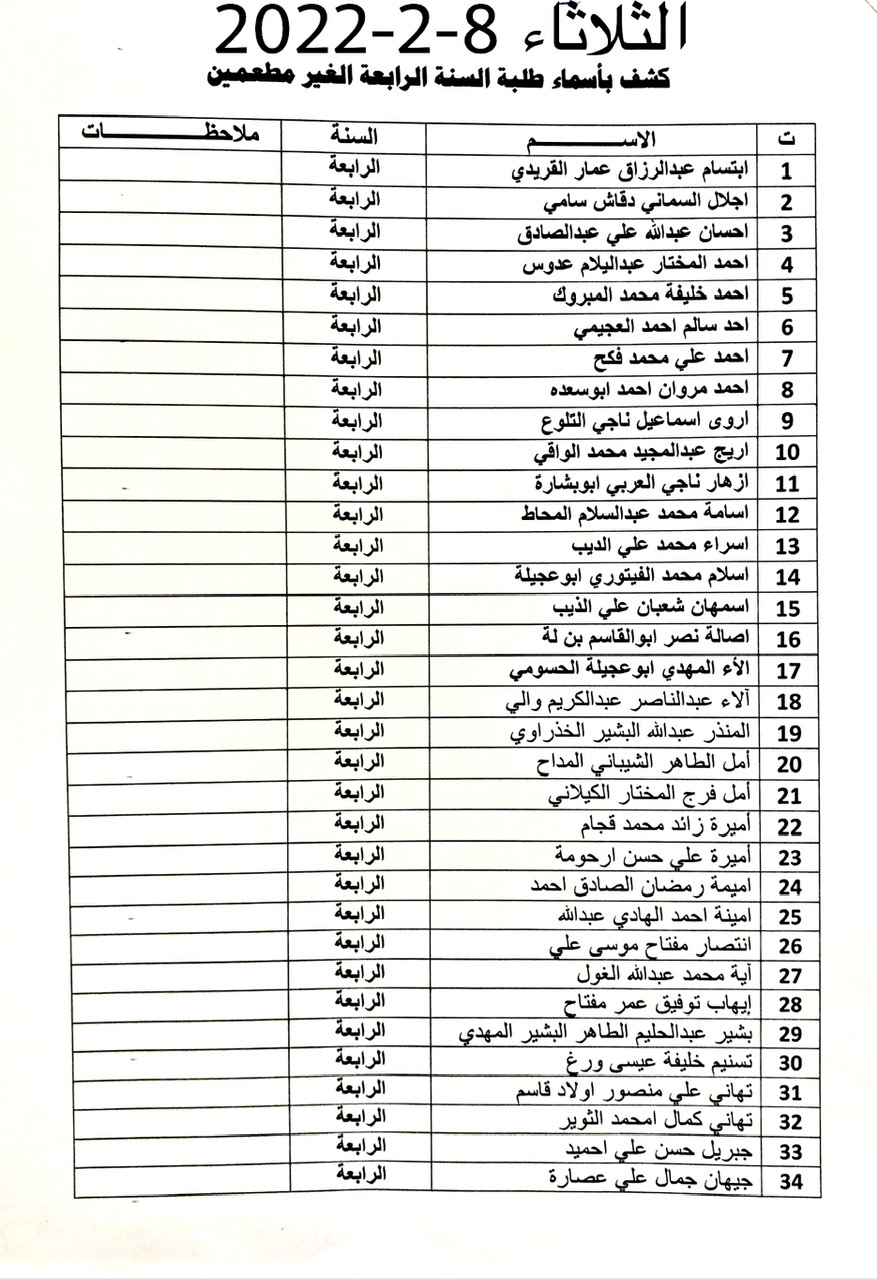 على الطلبة المدرجة أسماؤهم في القوائم مراجعة مكتب المسجل كل حسب الأيام المحددة في القوائم واحضار مايثبت تلقيهم التطعيم ضد فايروس كورونا .
