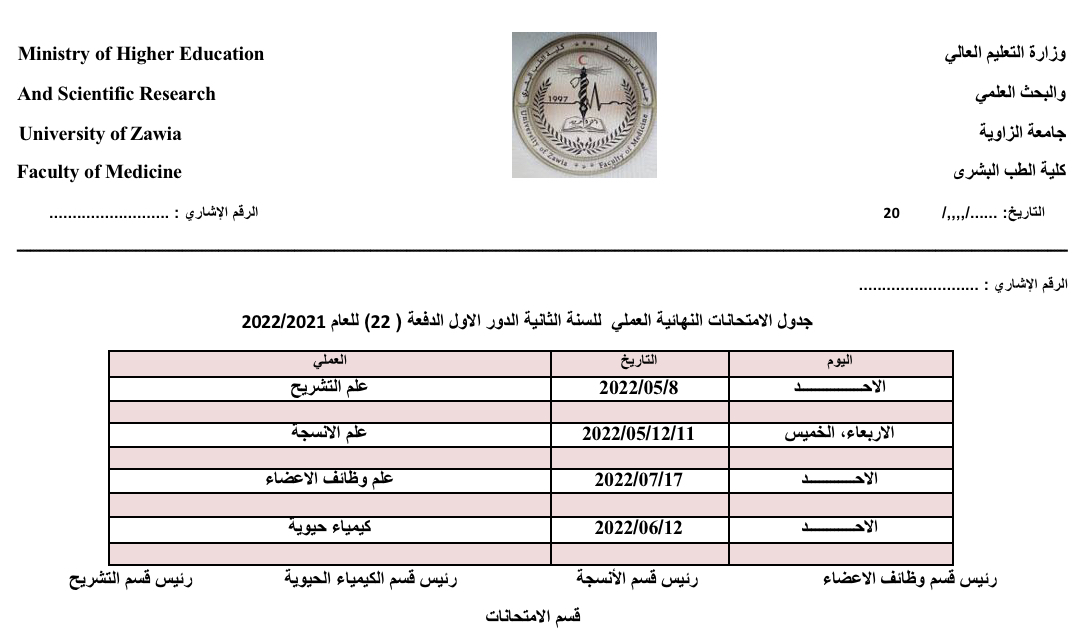 جدول الامتحانات النهائيه الدور الأول (العملي والنظري) للسنة الثانية طب بشري.
