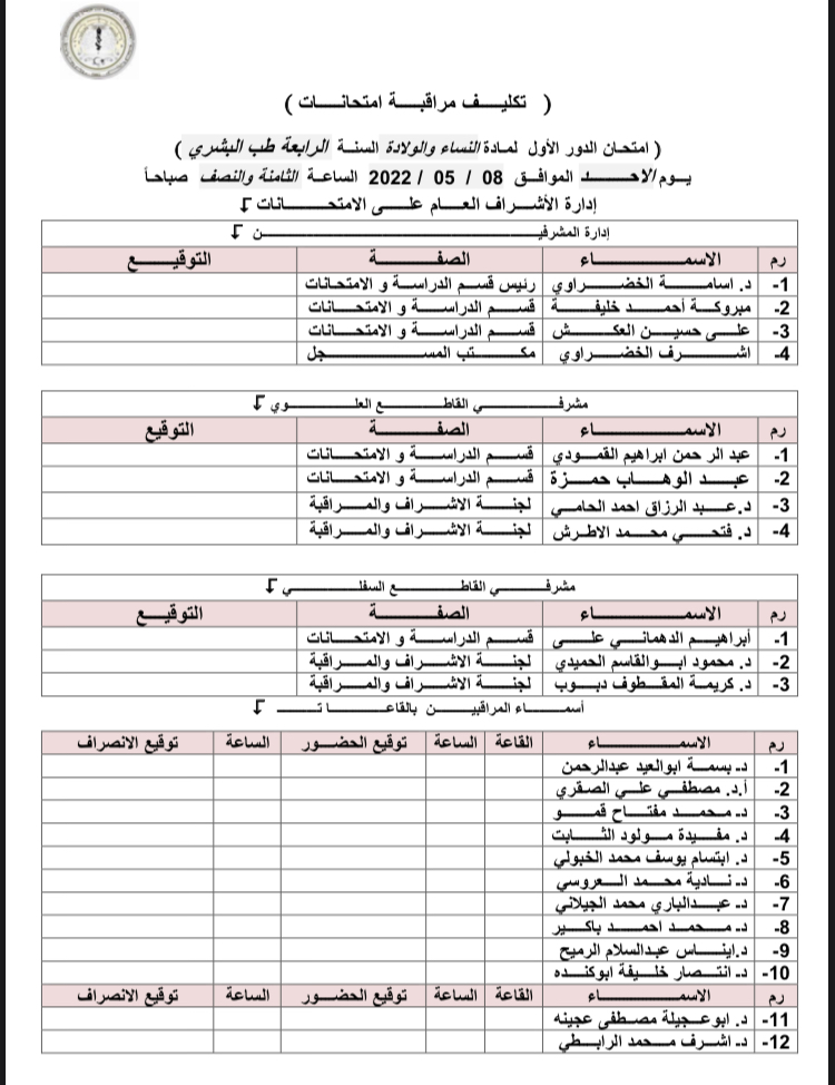اسماء المكلفين بمراقبة امتحان الدور الثاني لمادة النساء والولادة وذلك يوم الأحد الموافق 8-5-2022 .