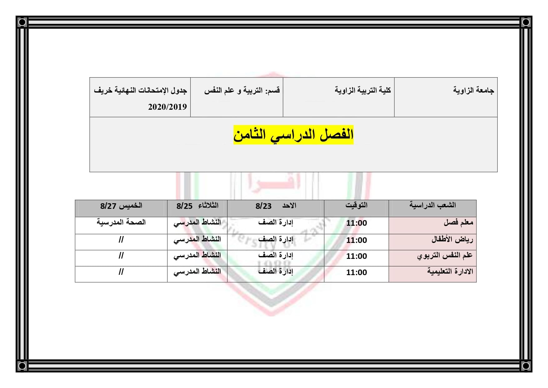 جدول الإمتحانات النهائية لقسم التربية و علم النفس