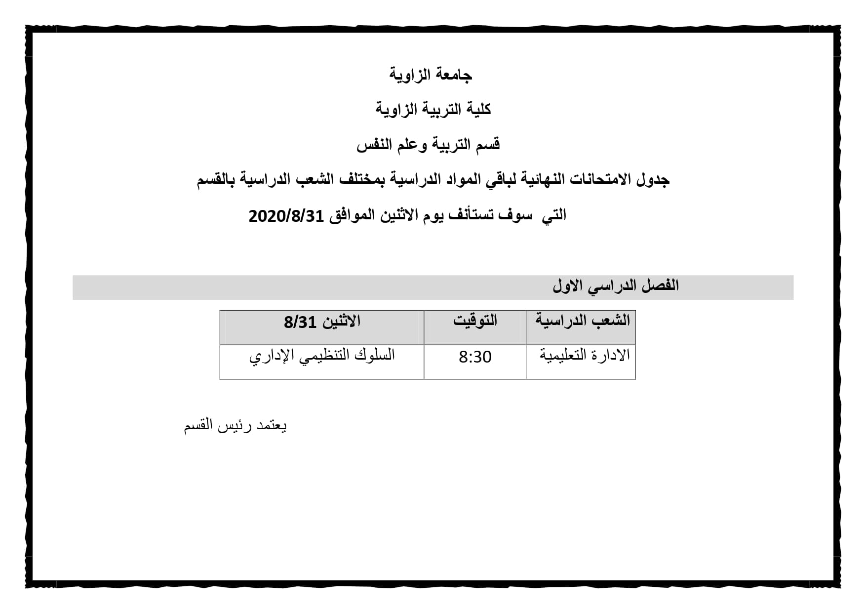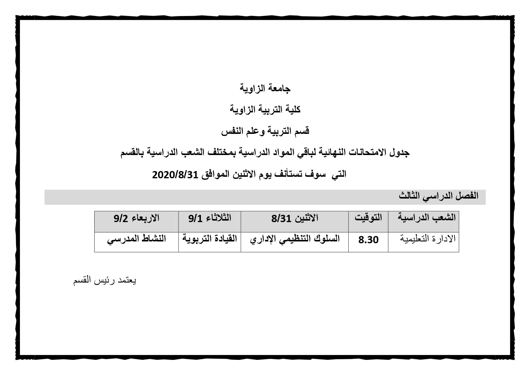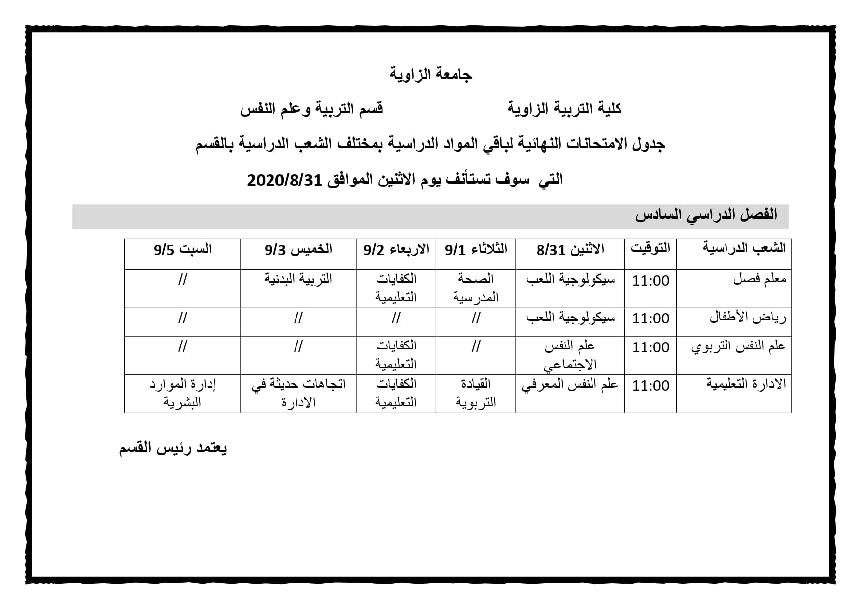 جدول إستكمال الإمتحانات النهائية ( قسم التربية و علم النفس )