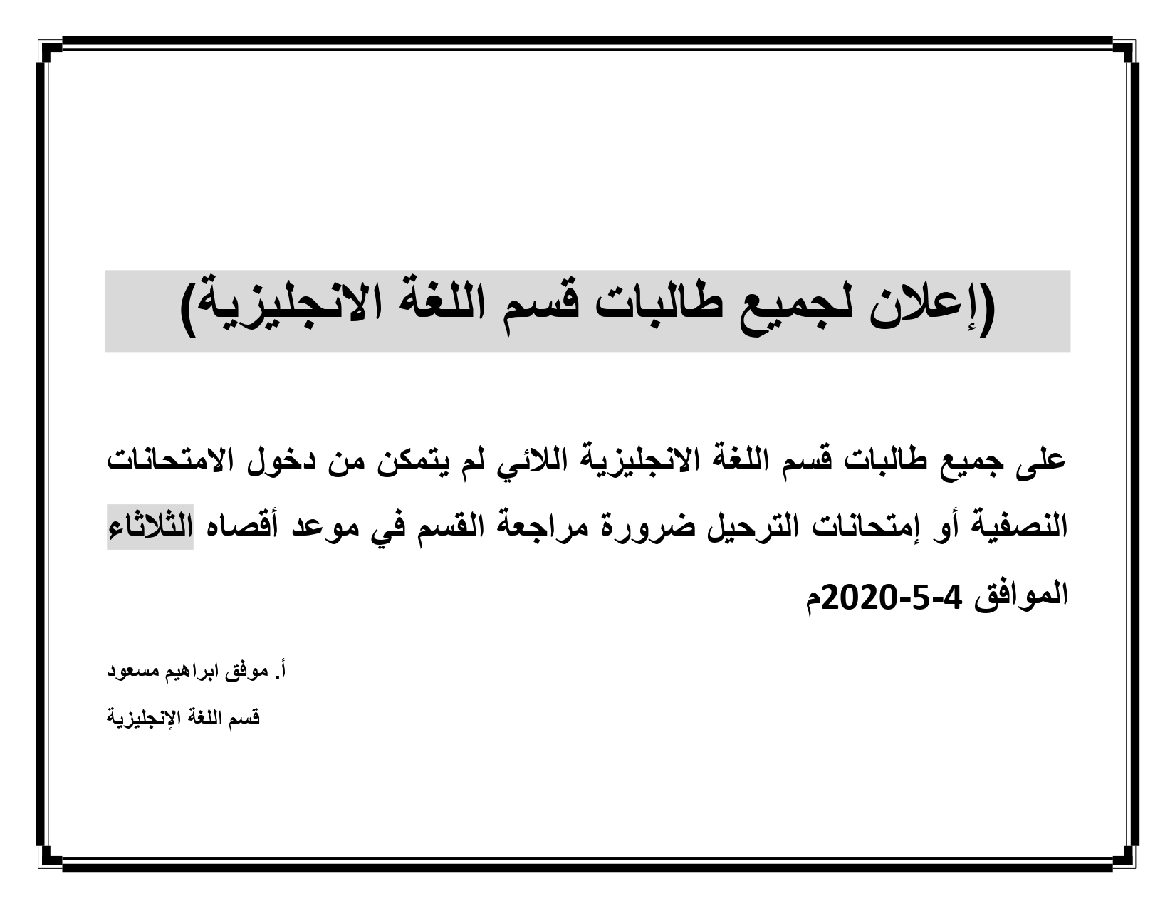 على جميع طالبات قسم اللغة الانجليزية اللائي لم يتمكن من دخول الامتحانات النصفية أو إمتحانات الترحيل ضرورة مراجعة القسم في موعد أقصاه الثلاثاء الموافق 4-5-2020م