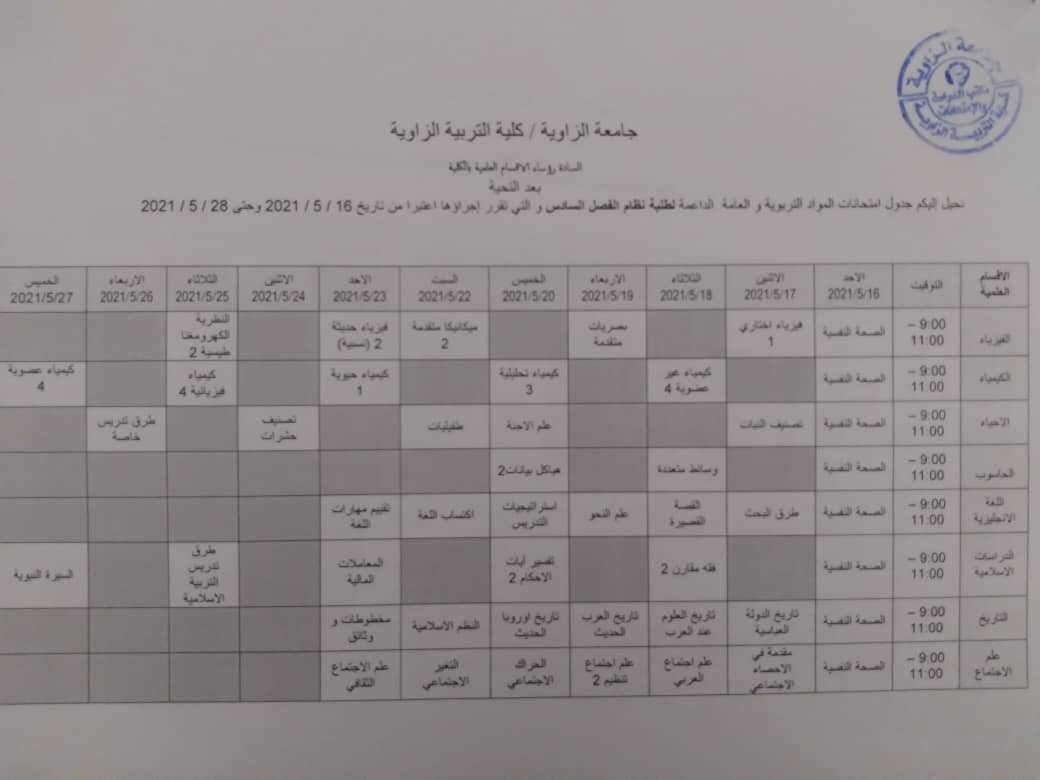 جدول الامتحانات النهائية لجميع الاقسام عد قسمي الرياضيات والتربية وعلم النفس
