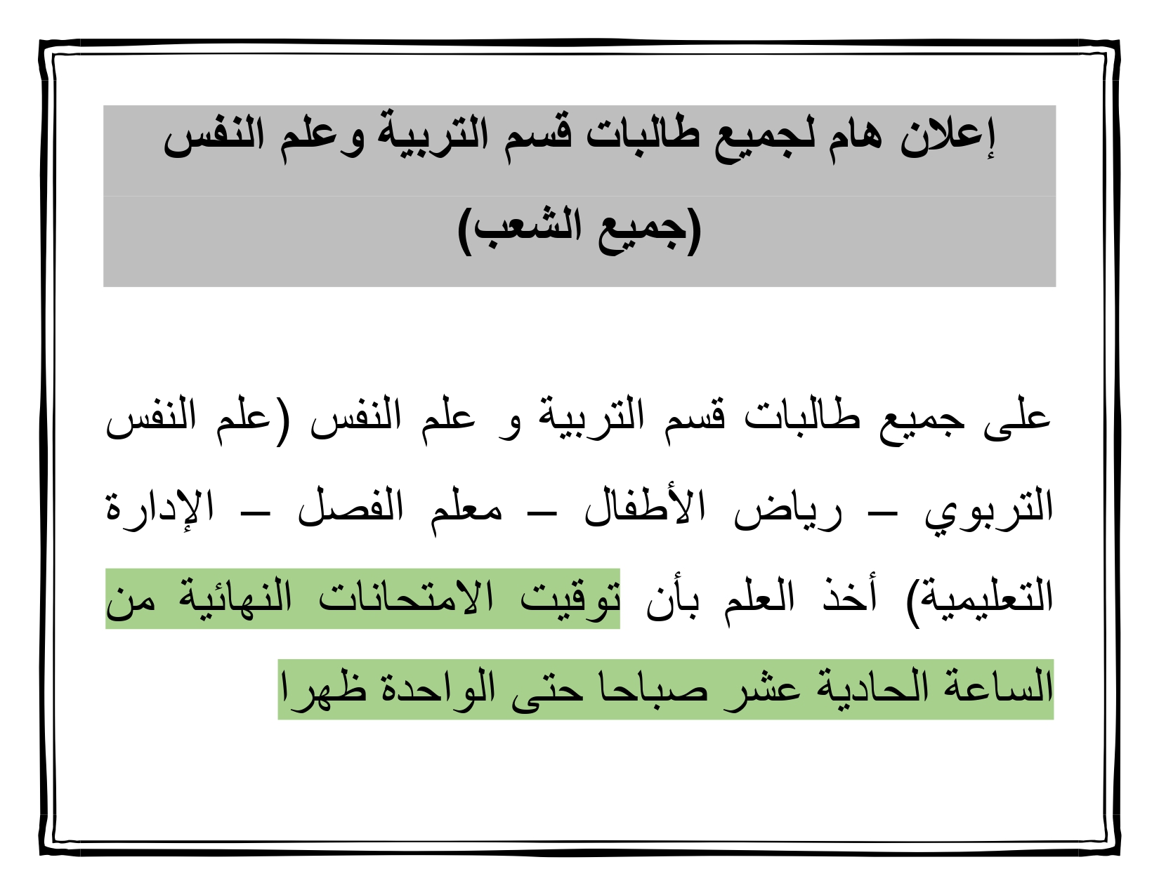 على جميع طالبات قسم التربية و علم النفس (علم النفس التربوي – رياض الأطفال – معلم الفصل – الإدارة التعليمية) أخذ العلم بأن توقيت الامتحانات النهائية من الساعة الحادية عشر صباحا حتى الواحدة ظهرا