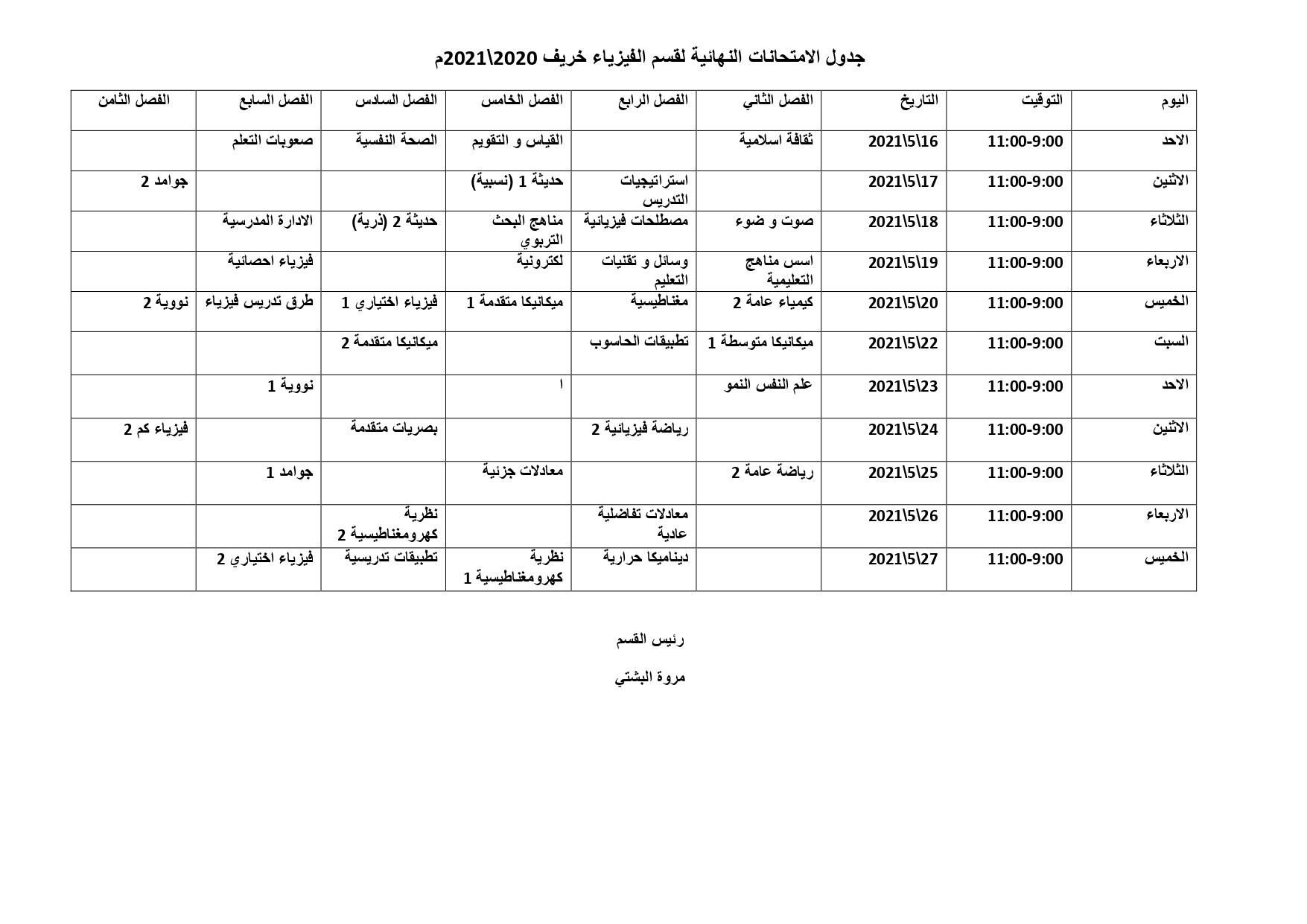 جدول الامتحانات النهائية لقسم الفيزياء خريف 2020\2021م