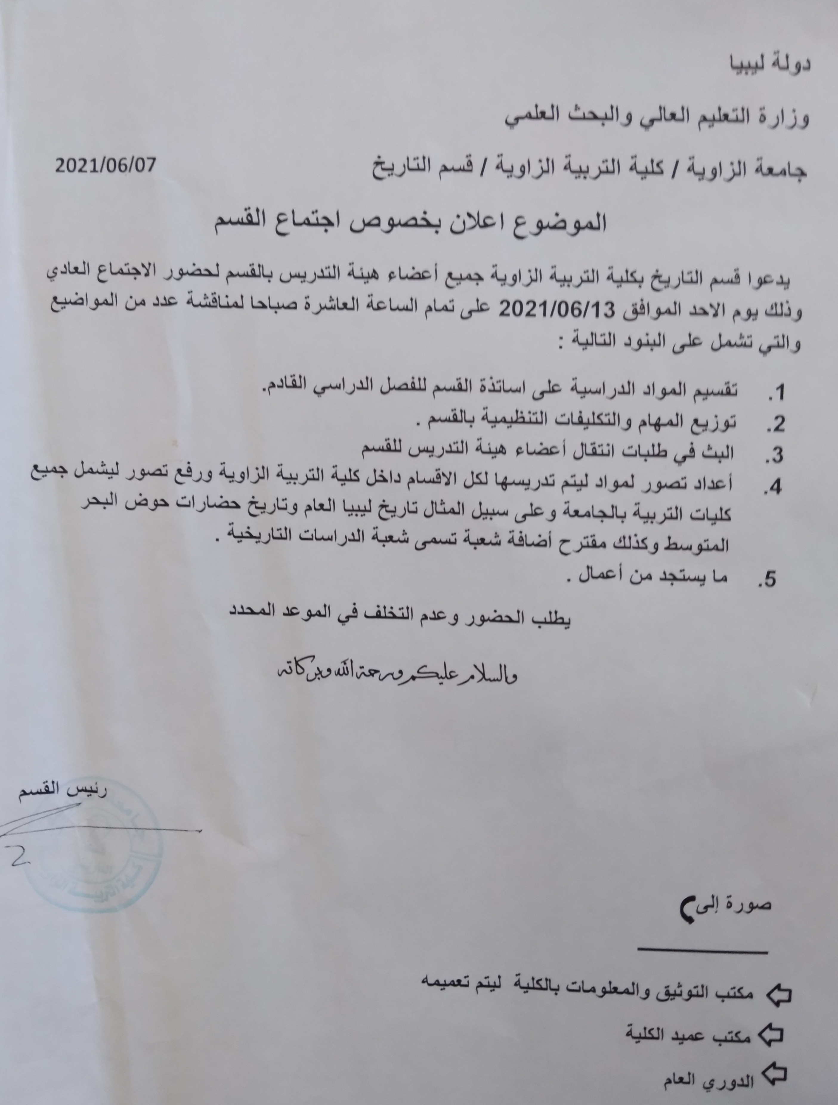 يدعو قسم التاريخ بكلية التربية الزاوية جميع أعضاء هيئة التدريس بالقسم لحضور الاجتماع العادي يوم الاحد الموافق 13-6-2021م على تمام الساعة العاشرة صباحا.