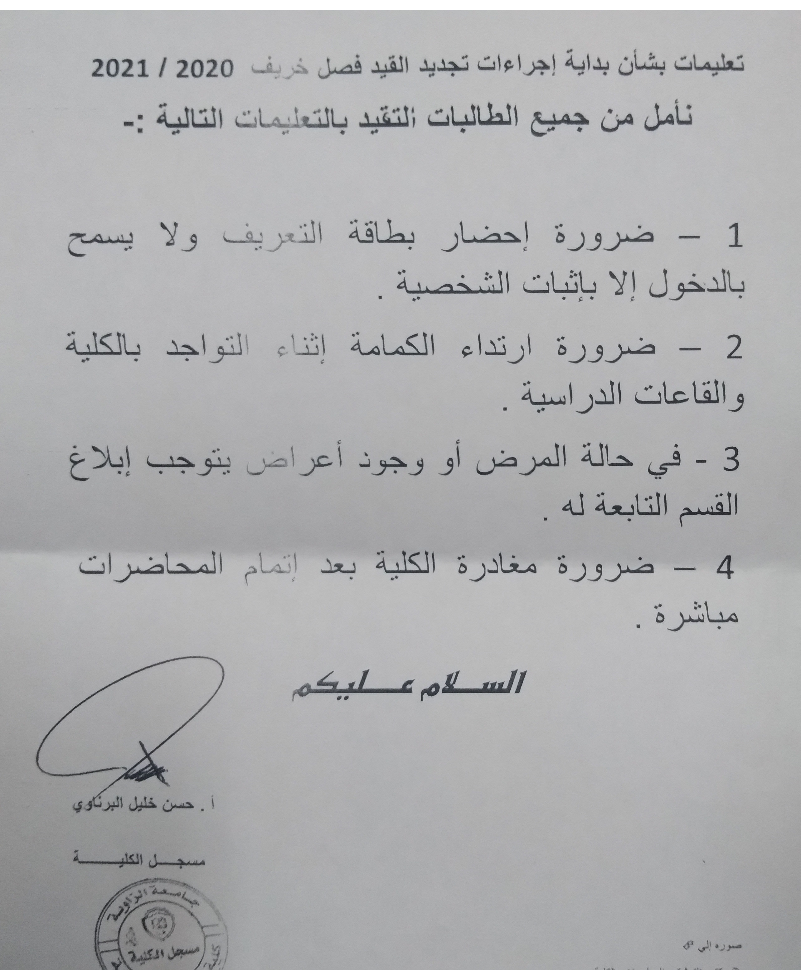 على جميع الطلبة أخذ العلم بأن تجديد القيد لفصل (الخريف 2021-2022) ابتداء من يوم الاحد الموافق 2021/09/05 م لمدة اسبوعين وذالك حسب الجدول واليوم المحدد لكل قسم حسب الجدول المرفق.