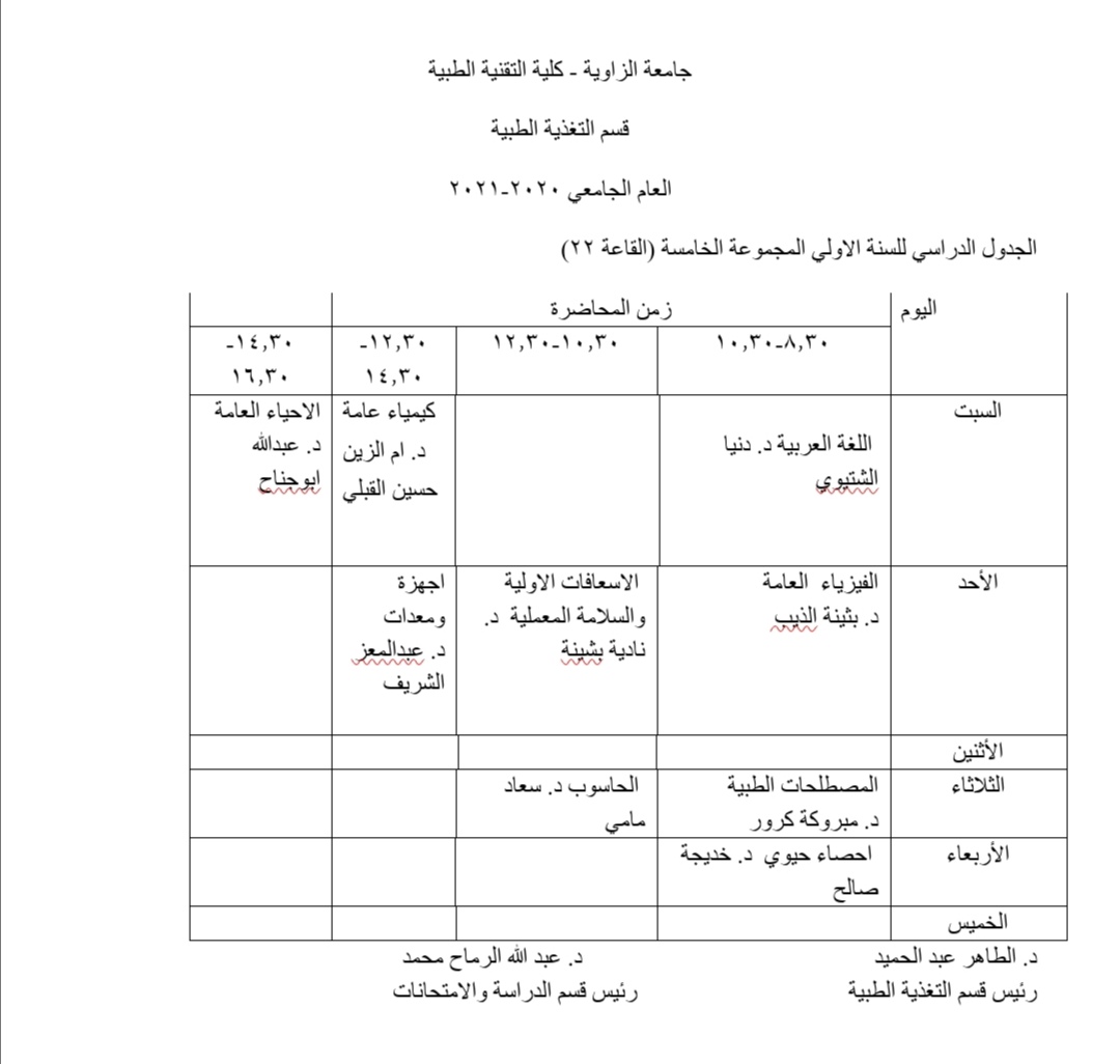 الجدول الدراسي للسنة الأولى للعام الجامعي 2021/2020م الجدول الدراسي للسنة الأولى للعام الجامعي 2021/2020م