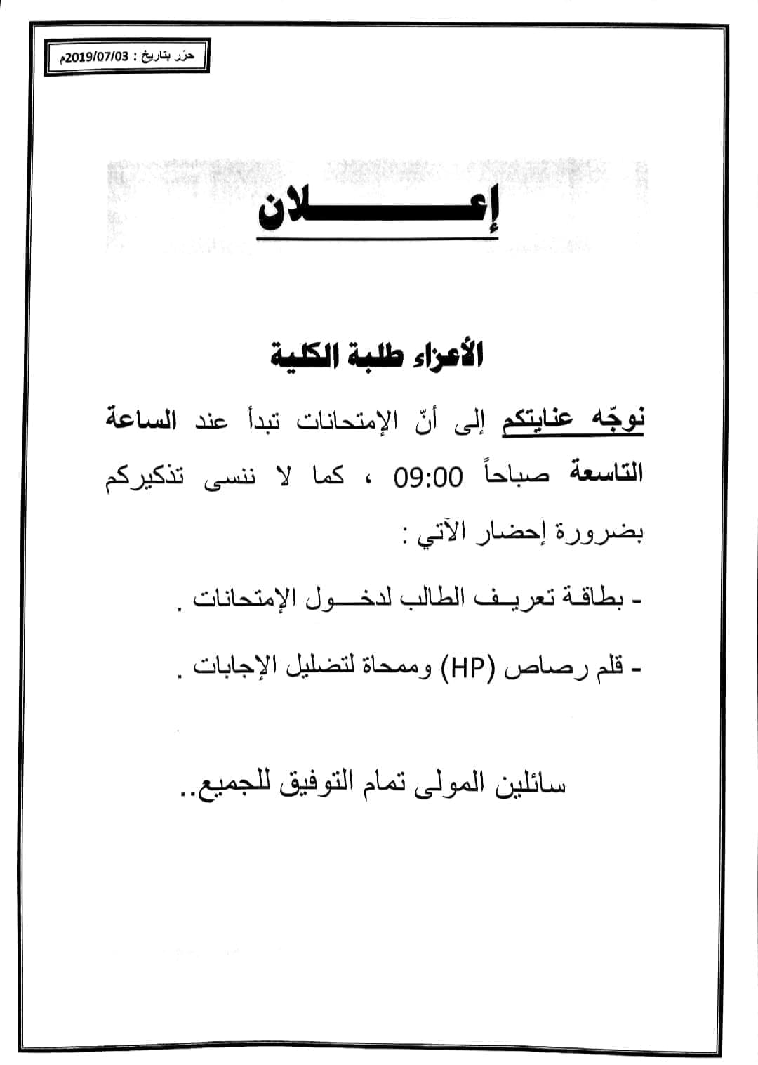 الاعزاء طلبة الكلية