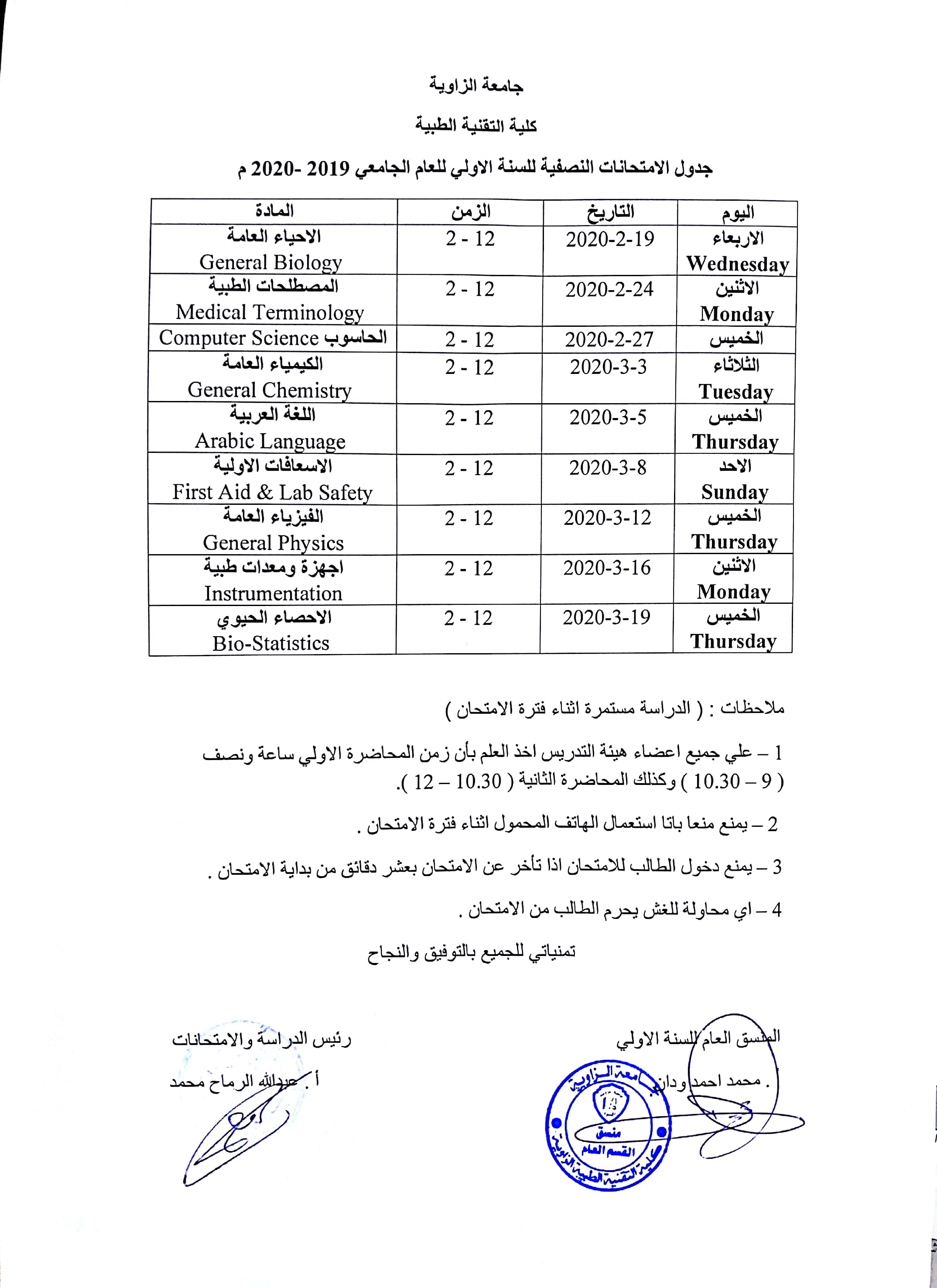نرجوا منكم التقيد والحضور للمراقبة والإشراف على الإمتحانات النصفية لطلبة السنة الأولى حسب الجدول الموضح أدنى هذا الإعلان ، علماً بأنه سوف تُتّخذ كافة الإجراءات والتدابير القانونية حيال المتغيبين .
