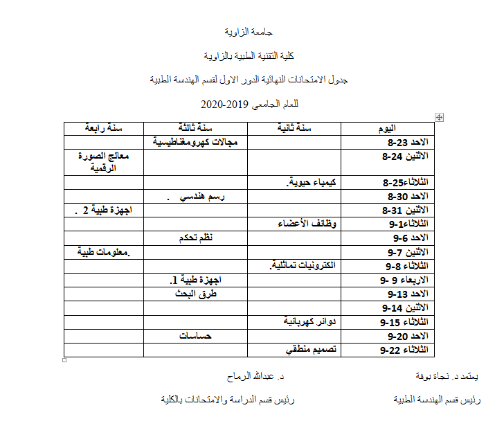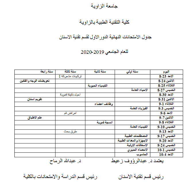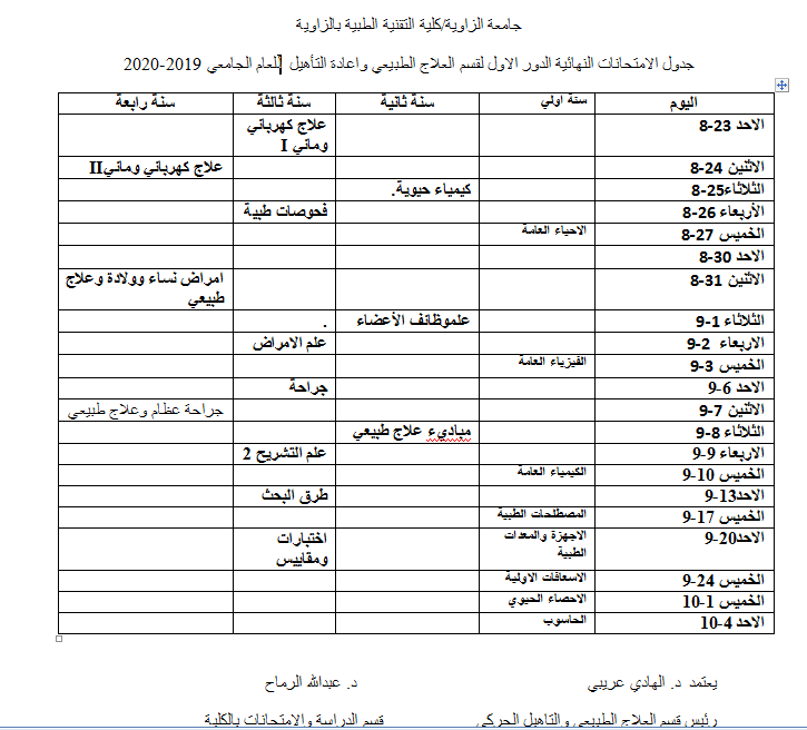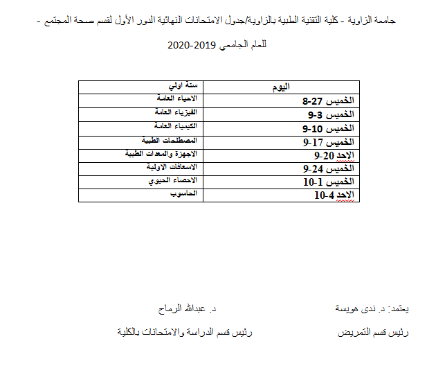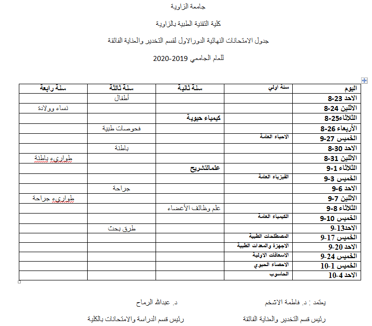 جداول الامتحانات النهائية للعام الدراسي 2019/2020 لجميع الاقسام والسنوات بالكلية