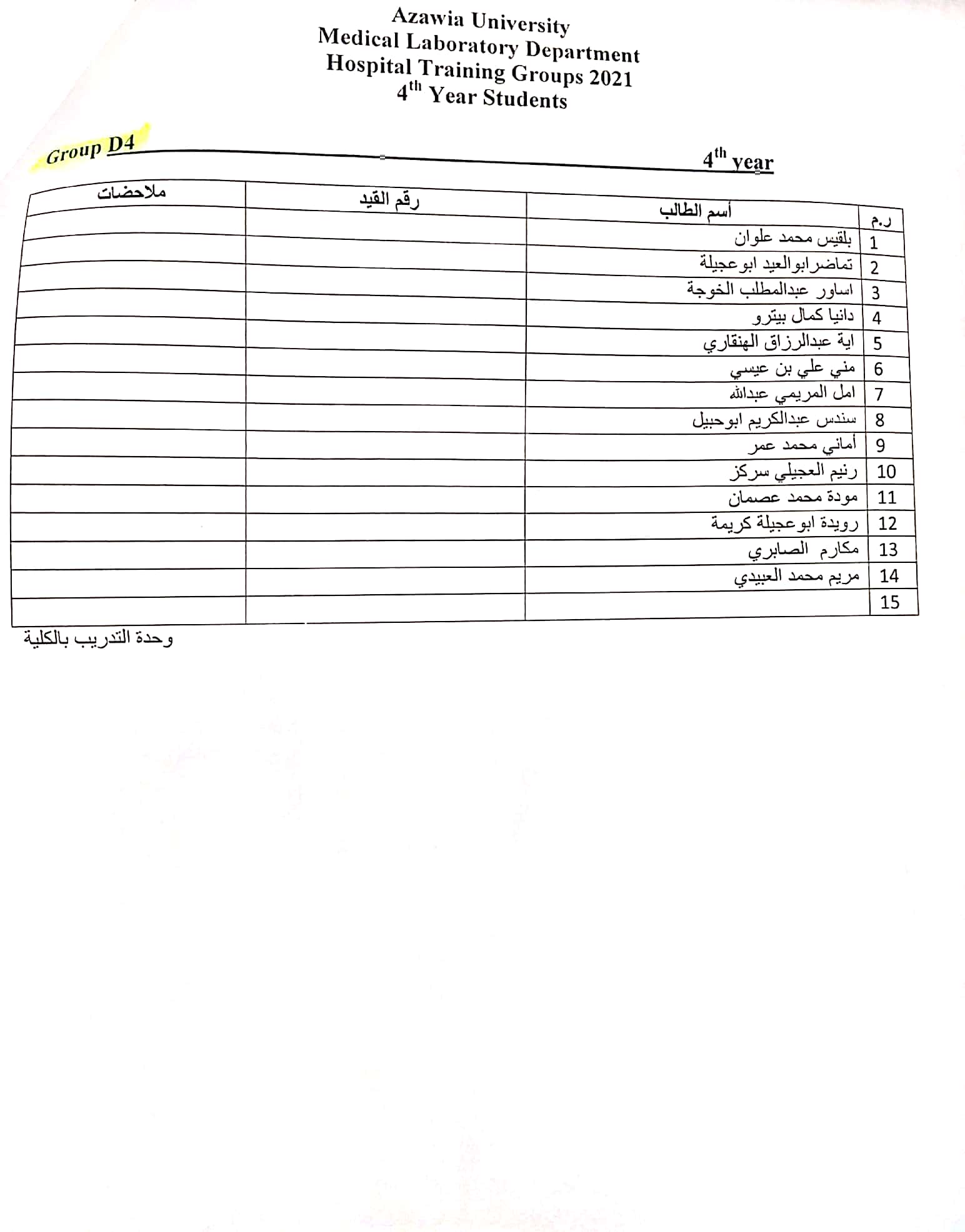 قوائم مجموعات تدريب المستشفى للسنة الرابعة بقسم المختبرات الطبية