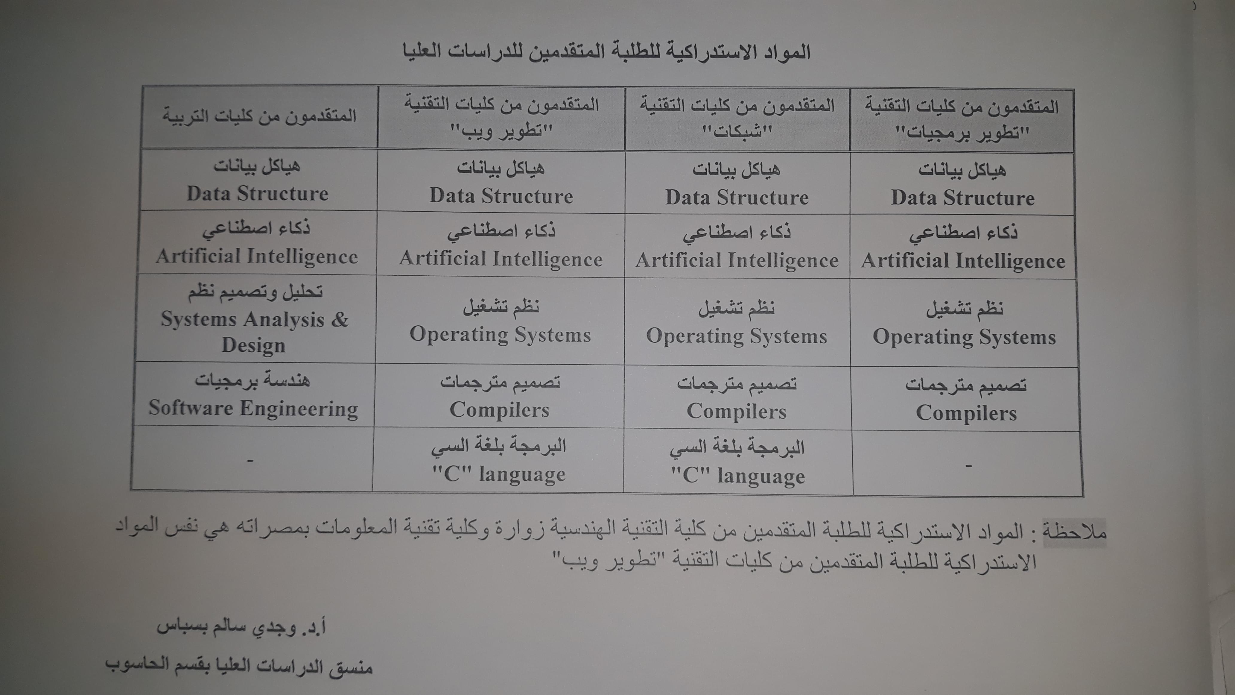 المقررات الاستدراكية المقررة للطلبة الملتحقين بالدراسات العيا قسم الحاسوب حسب مؤهلاتهم