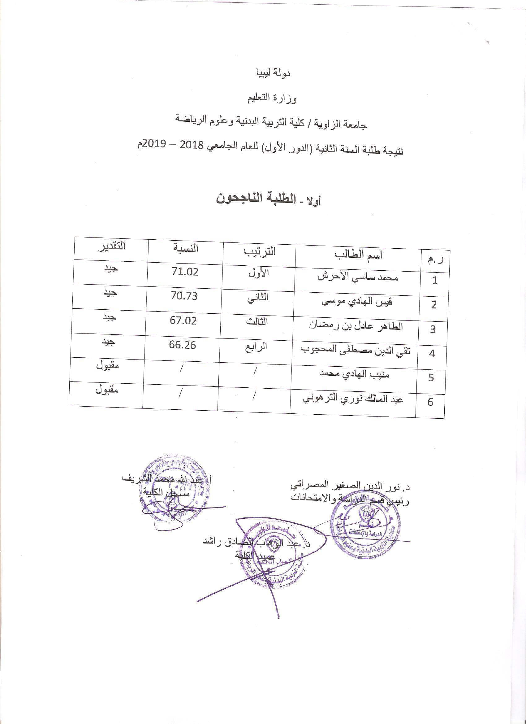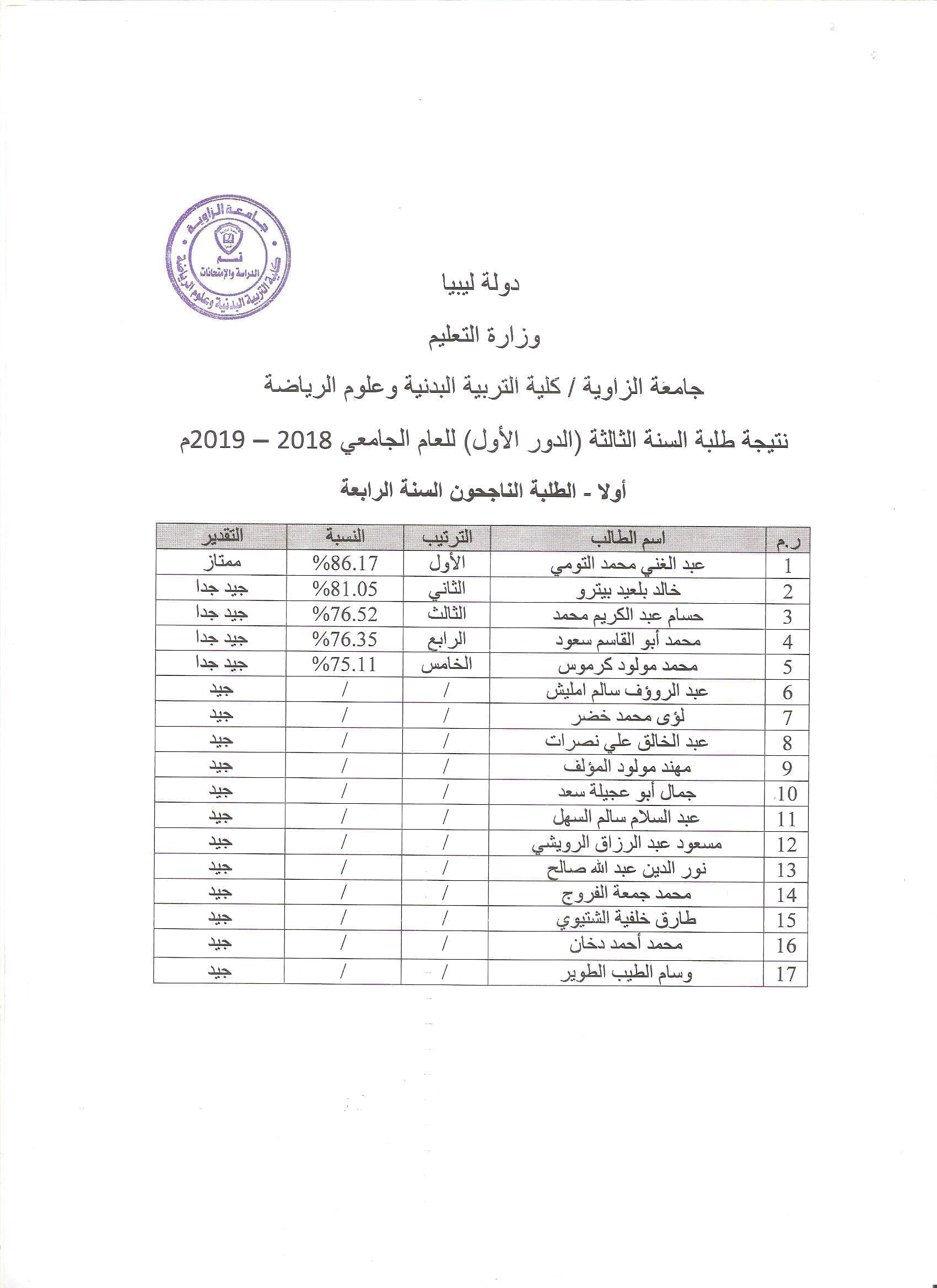 نتيجة كلية التربية البدنية وعلوم الرياضة الدور الاول لسنة 2018-2019