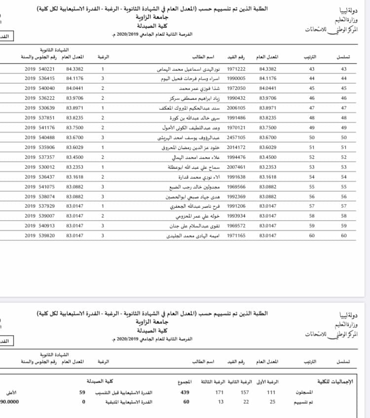 قوائم الفرصه الثانية للعام الجامعي 2019-2020 على الطلبه الوارده اسمائهم في القوائم التوجه إلى إدارة المسجل العام مصحوبينبالمستندات التاليه