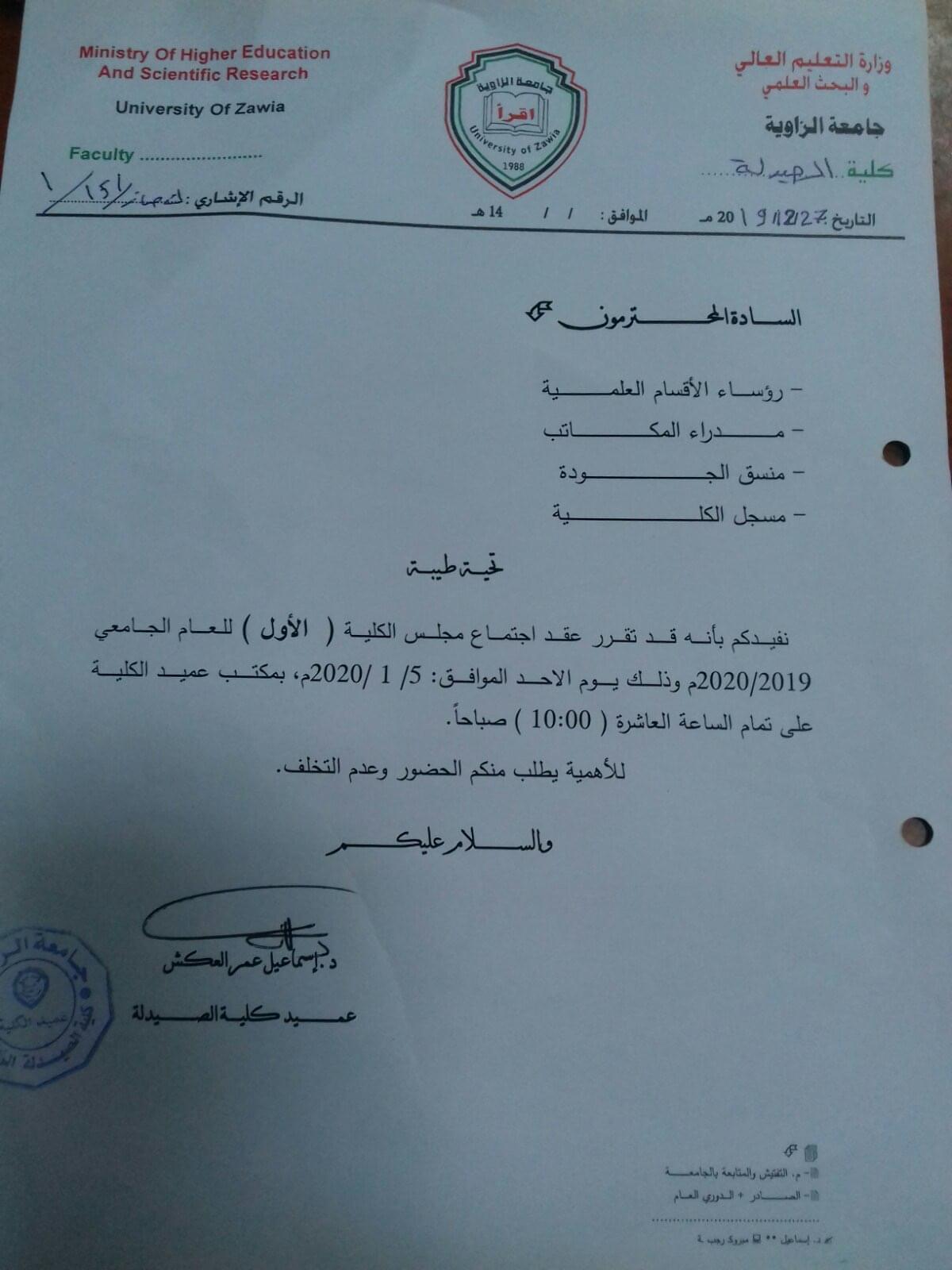 نفيدكم بانه قد تقرر عقد اجتماع مجلس الكلية ( الاول ) للعام الجامعي 2020/2019 م وذلك يوم الاحد الموافق 2020/1/5م بمكتب عميد الكلية على تمام الساعة 10 صباحا .