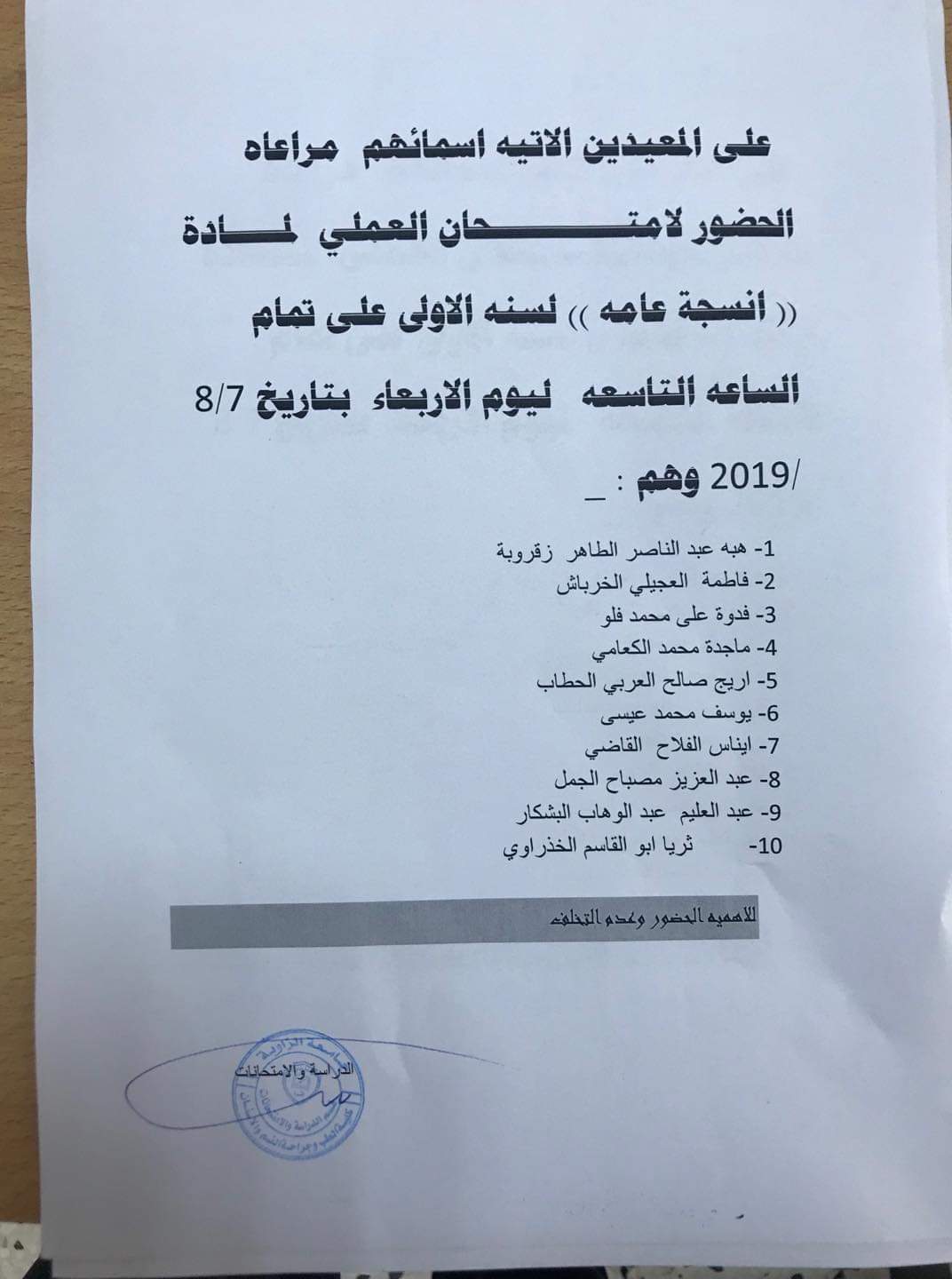 علي المعيدين الاتيه أسمائهم مراعاة الحضور إمتحان العملي لمادة (أنسجة عامة) لسنة الأولي علي تمام الساعه 9:00 صباحا ليوم الأربعاء بتاريخ 7_8_2019 للحصول على قائمة الأسماء اضغط علي المزيد