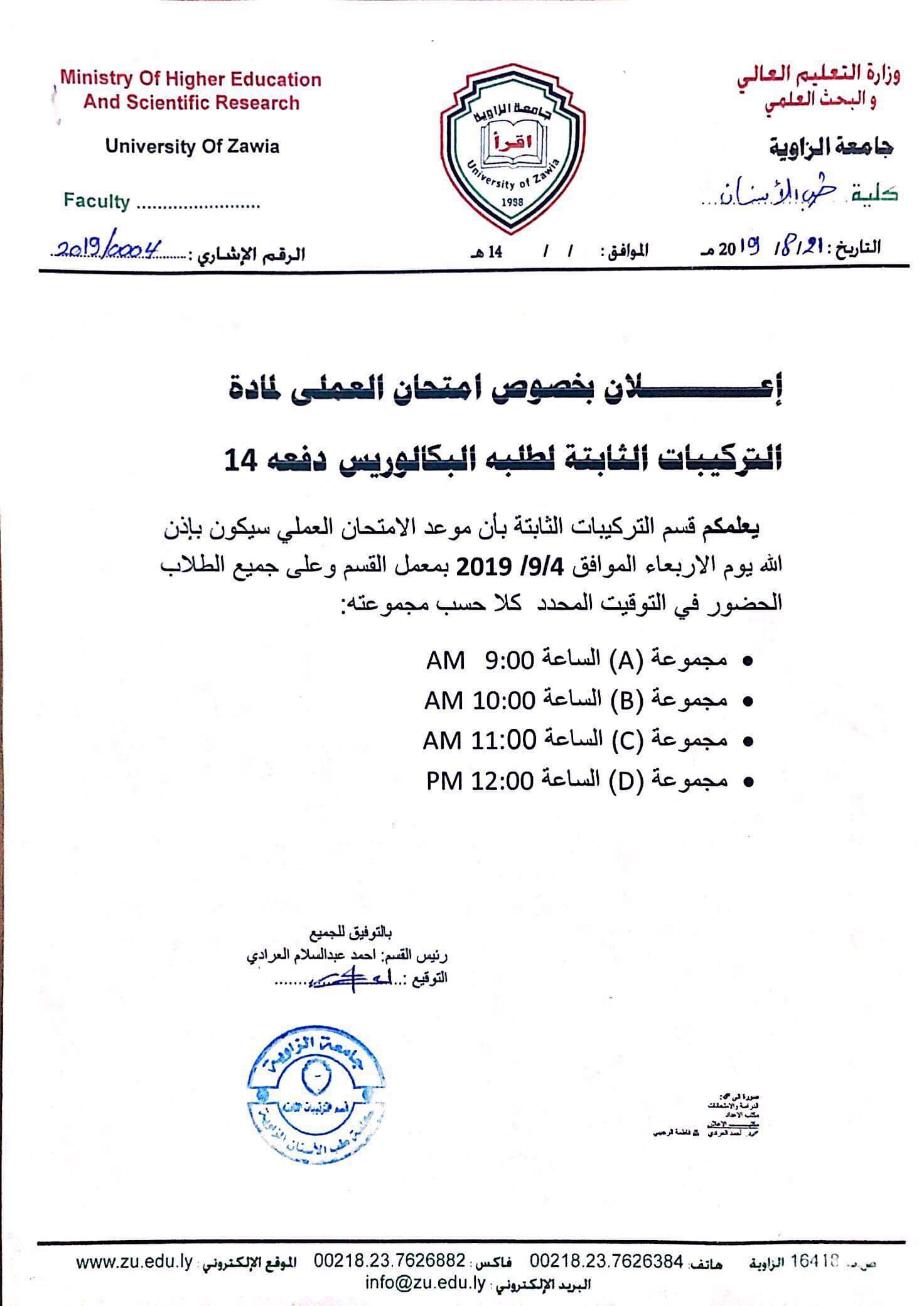 إعلان بخصوص إمتحان العملي لمادة التركيبات الثابتة لطلبة البكالوريوس دفعة 14