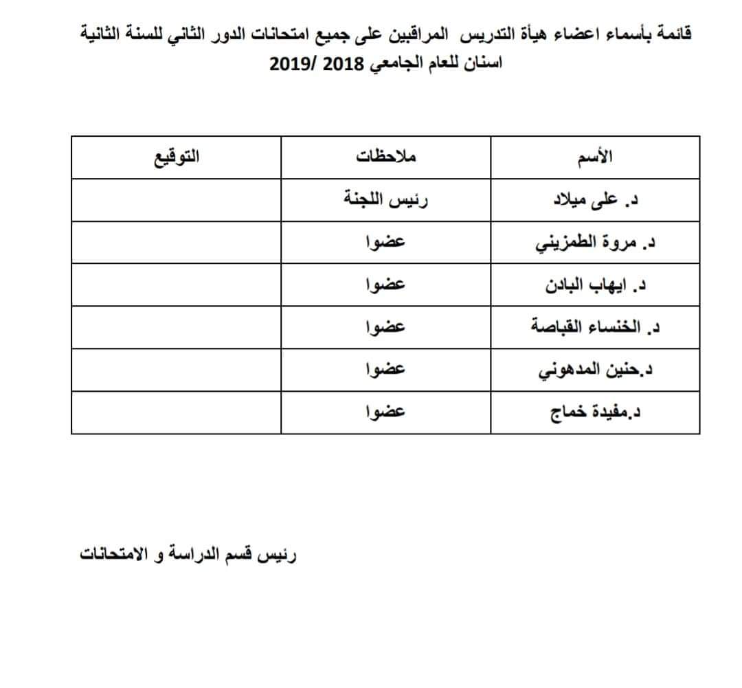 قائمة بأسماء أعضاء هيئة التدريس المشرفين على امتحانات الدور الثاني للسنه الثانية قسم الدراسة والامتحانات