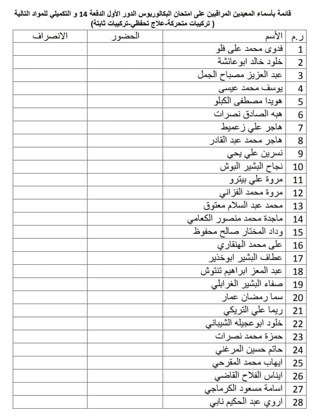 قائمة المعيدين المراقبين على امتحان التركيبات المتحركة الدور الأول الدفعة 14 والتكميلي ليوم السبت الموافق 11 / 1 / 2020 على تمام الساعة 9