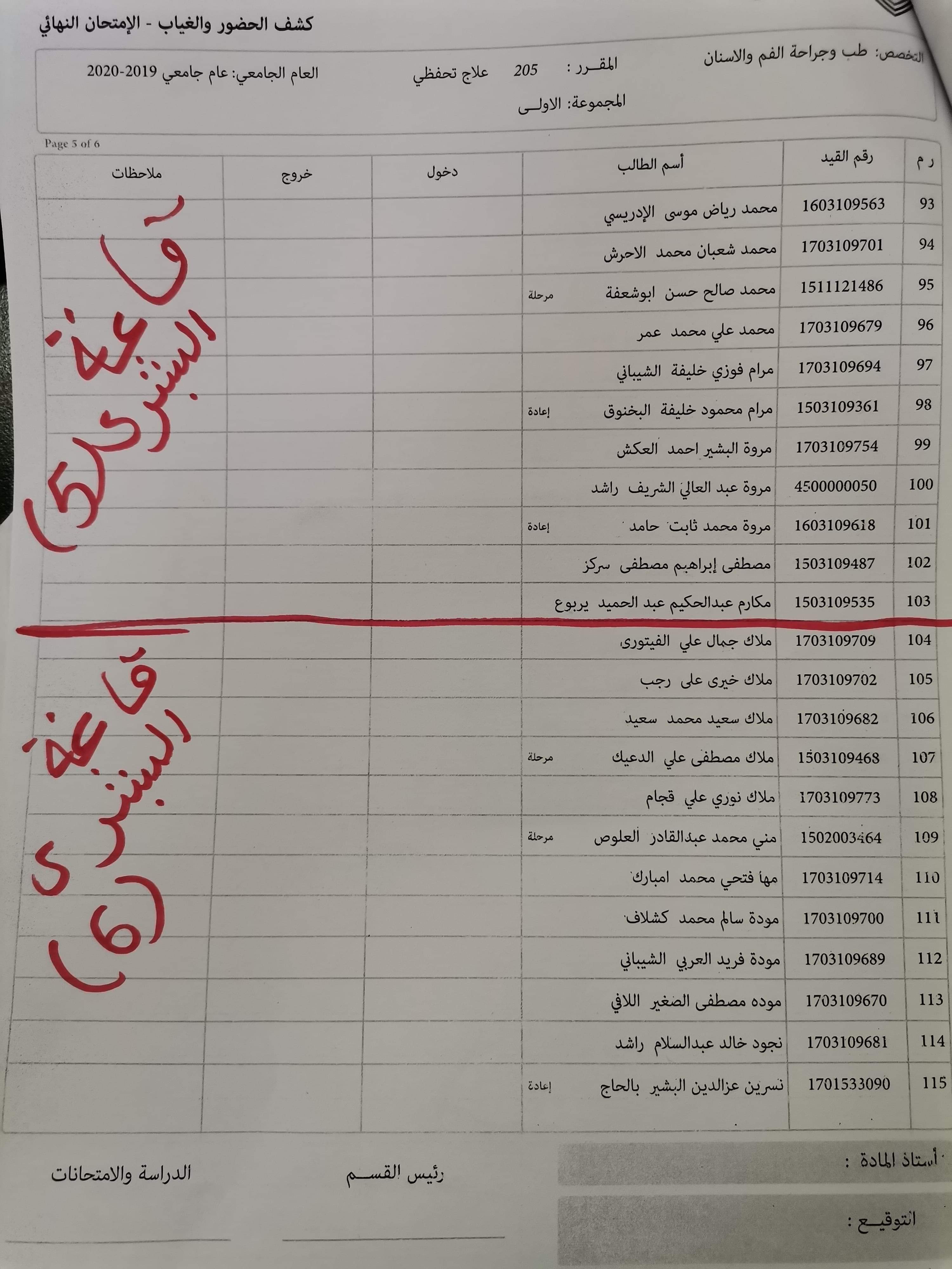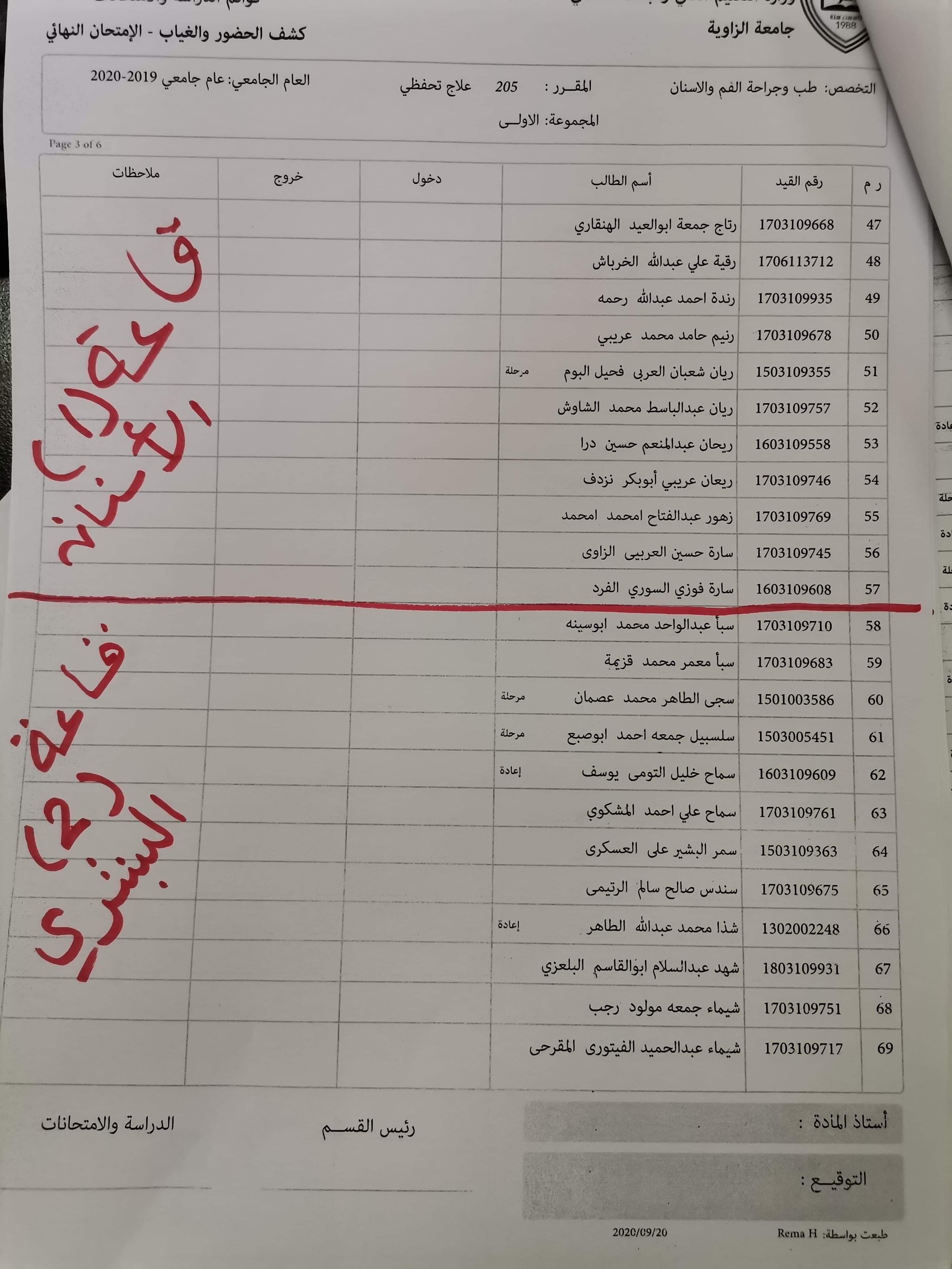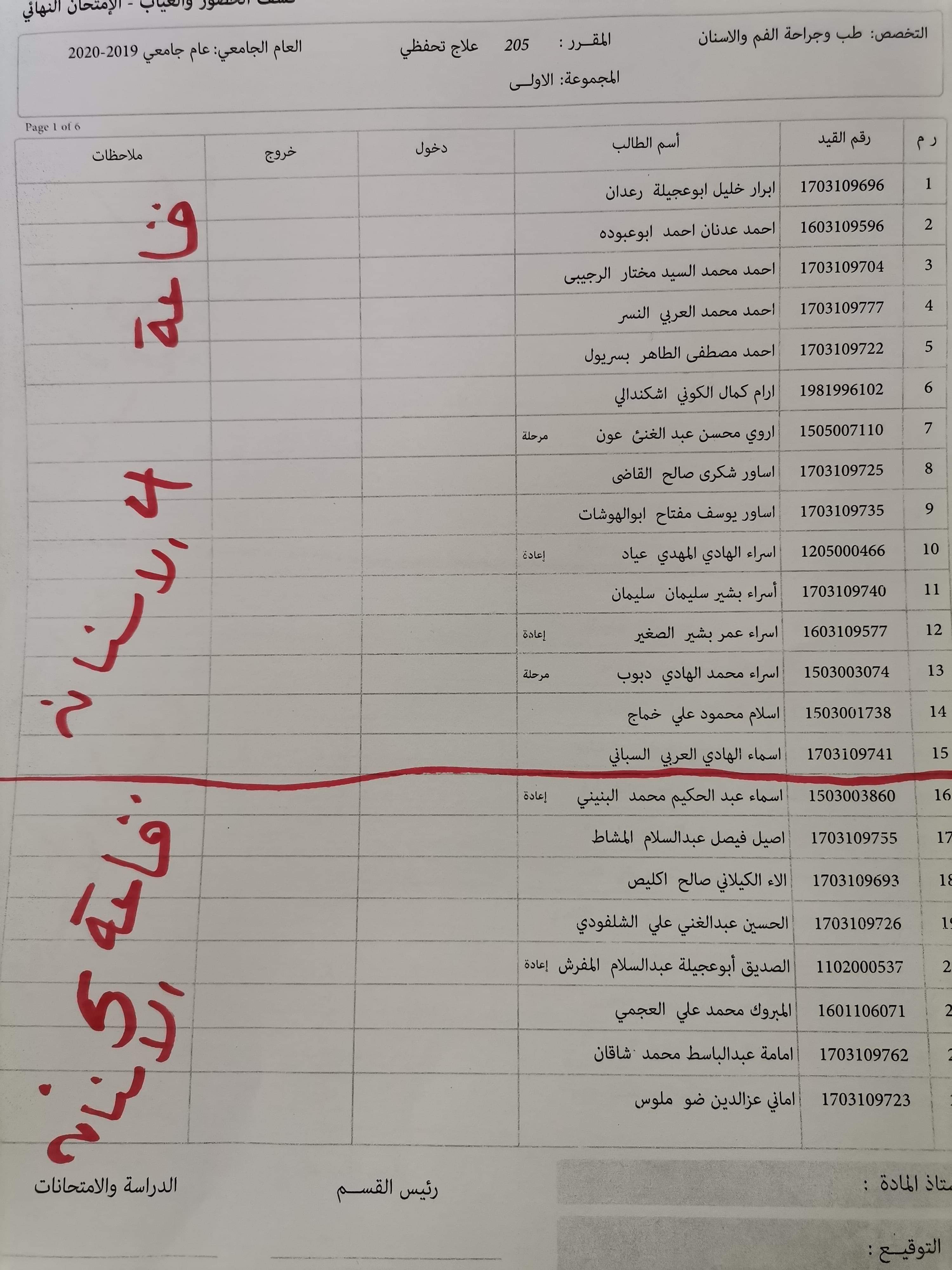 قوائم توزيع القاعات للامتحان يوم السبت الموافق 26/9/ 2020 على تمام الساعه 9 لمادة العلاج التحفظي للسنه الثانيه الدور الاول للعام الجامعي 2019 / 2020 بالتوفيق للجميع، يرجى الإلتزام بالإجراءات الوقائية