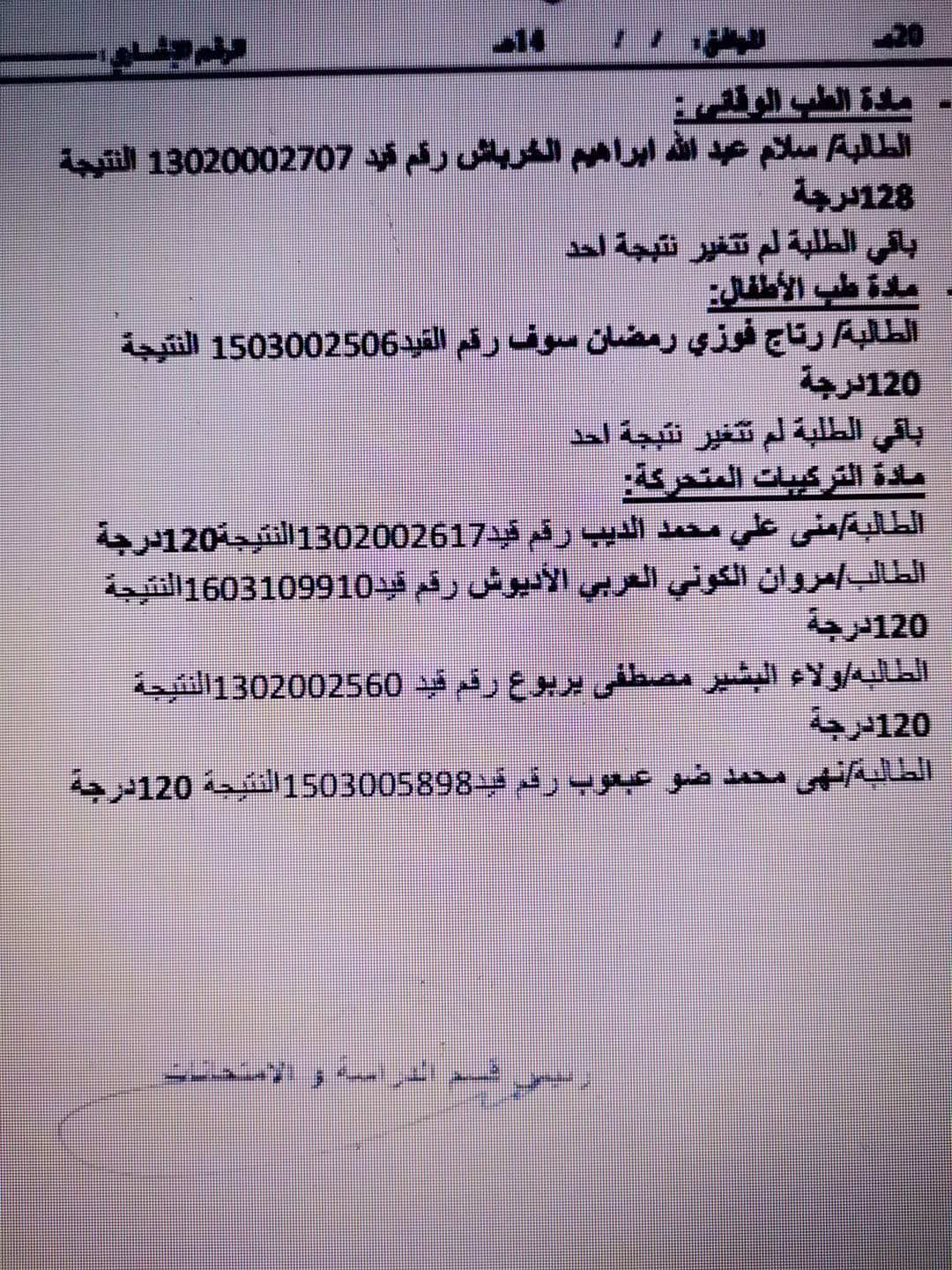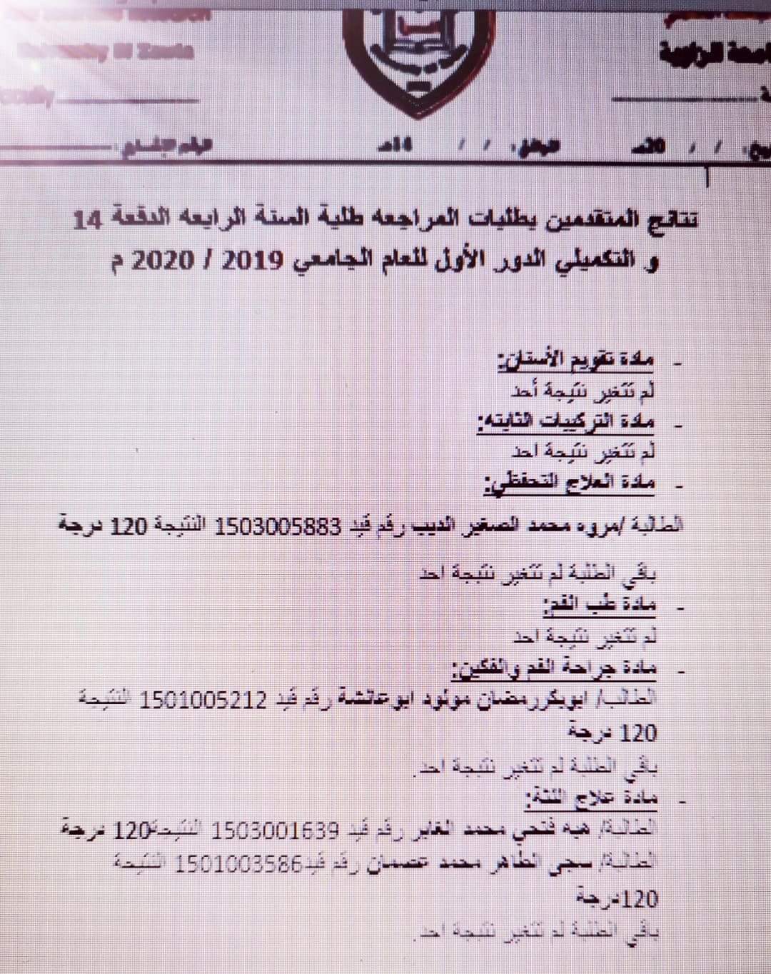 نتائج المتقدمين بطلبات المراجعه لطلبة السنة الرابعة الدفعة 14 والتكميلي الدور الأول للعام الجامعي 2019 /2020